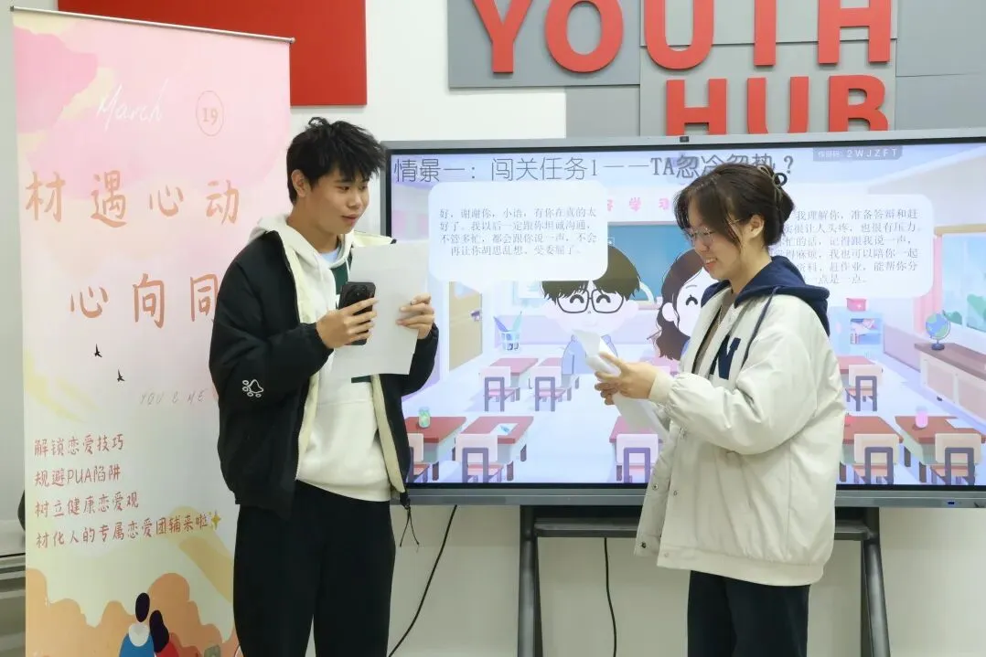 "恋爱避坑"情景闯关把活动推向高潮!分组演绎"忽冷忽热""吵架翻车"等常见情感困境。"原来沟通也是有壁垒的,需要双方坦诚""收获了不少情感处理的实用技巧"……大家纷纷分享感悟。"材式配对"趣味环节,更让同学们在协作中体会亲密关系的互补之道。