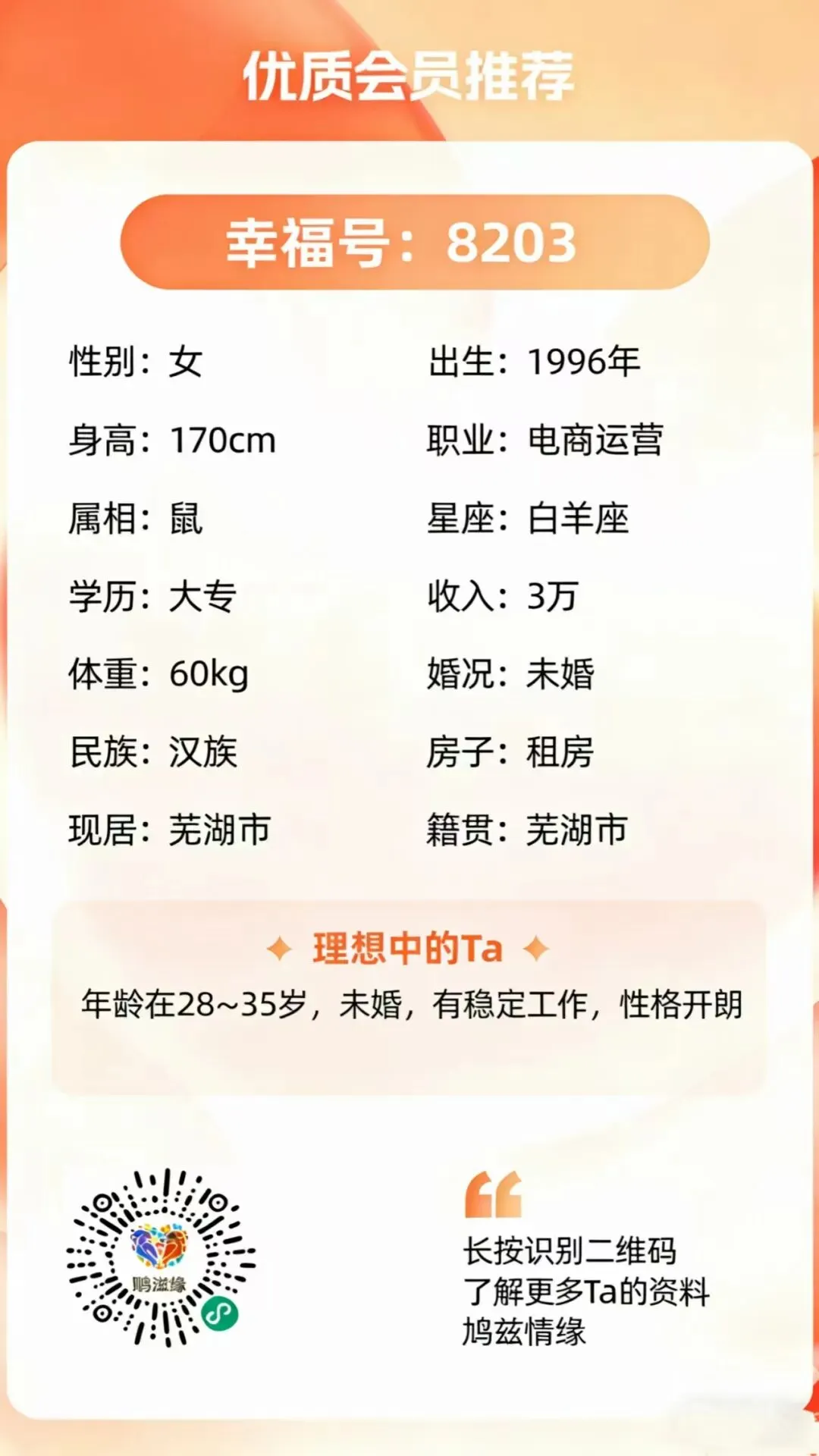目前注册登记实名单身男女50000+实名芜湖单身男女,杜绝虚假信息,让你见的每一个人都是“货真价实”: