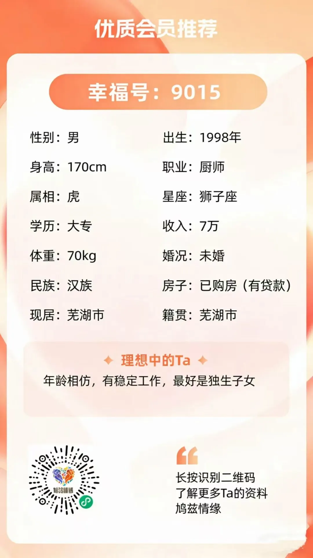 如果你也是芜湖单身,不想再“瞎找”,不想再等“缘分随机降临”,就来芜湖鸠兹情缘吧!这里有和你一样认真找对象的人,有8年专业和服务帮你铺路,下一个晒结婚证的,就是你!