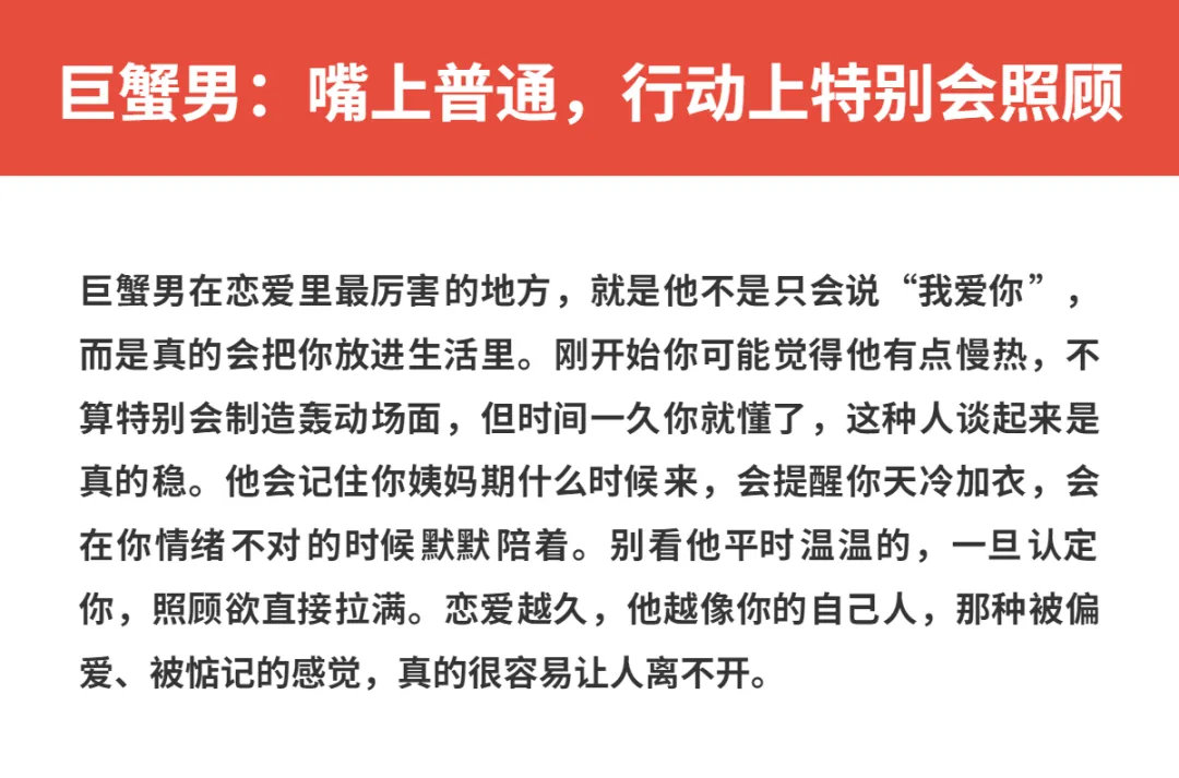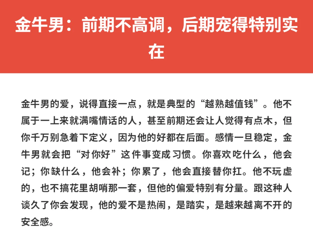 有些男生谈恋爱,刚开始轰轰烈烈,后面就慢慢降温;但也有一类人,真的是越相处越让人上头,时间越久,反而越会疼人。说白了,这种男生不是靠嘴甜赢,而是靠日复一日的细节把你拿捏住。你会发现,他可能前期没那么会演,但只要关系稳定下来,宠你、护你、懂你这件事,他是越来越熟练。今天就来聊聊那种恋爱越久越上头、越谈越会疼人的3大星座男,看看有没有你家那位。
