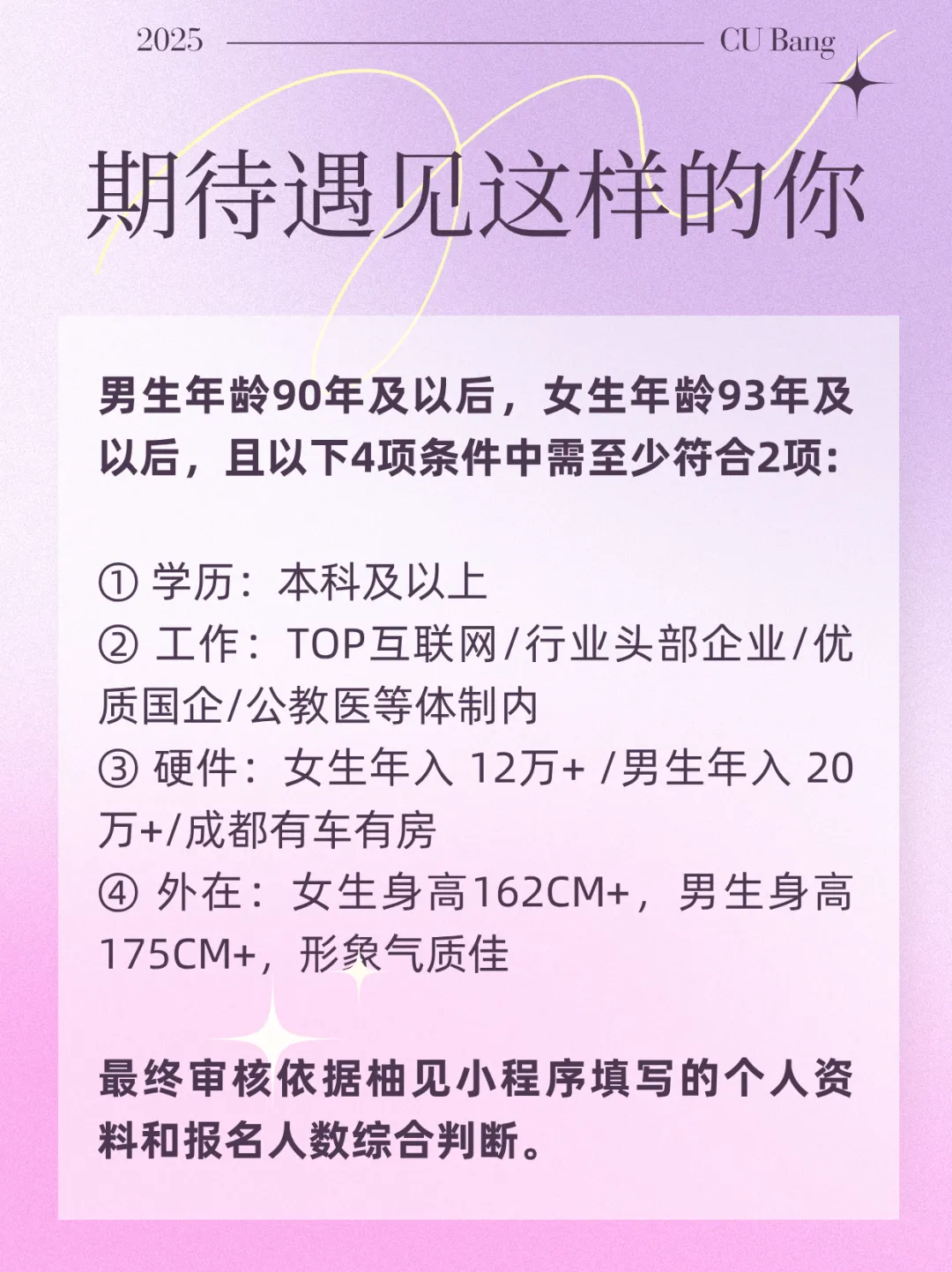 报名需在CU柚见小程序完善个人信息,填写的个人信息仅服务于活动,只有和你一样在CU Bang小程序报名同期活动的人,才能在活动开始的特定时间段,互相看到彼此信息。CU Bang将严格保密你的一切隐私信息!