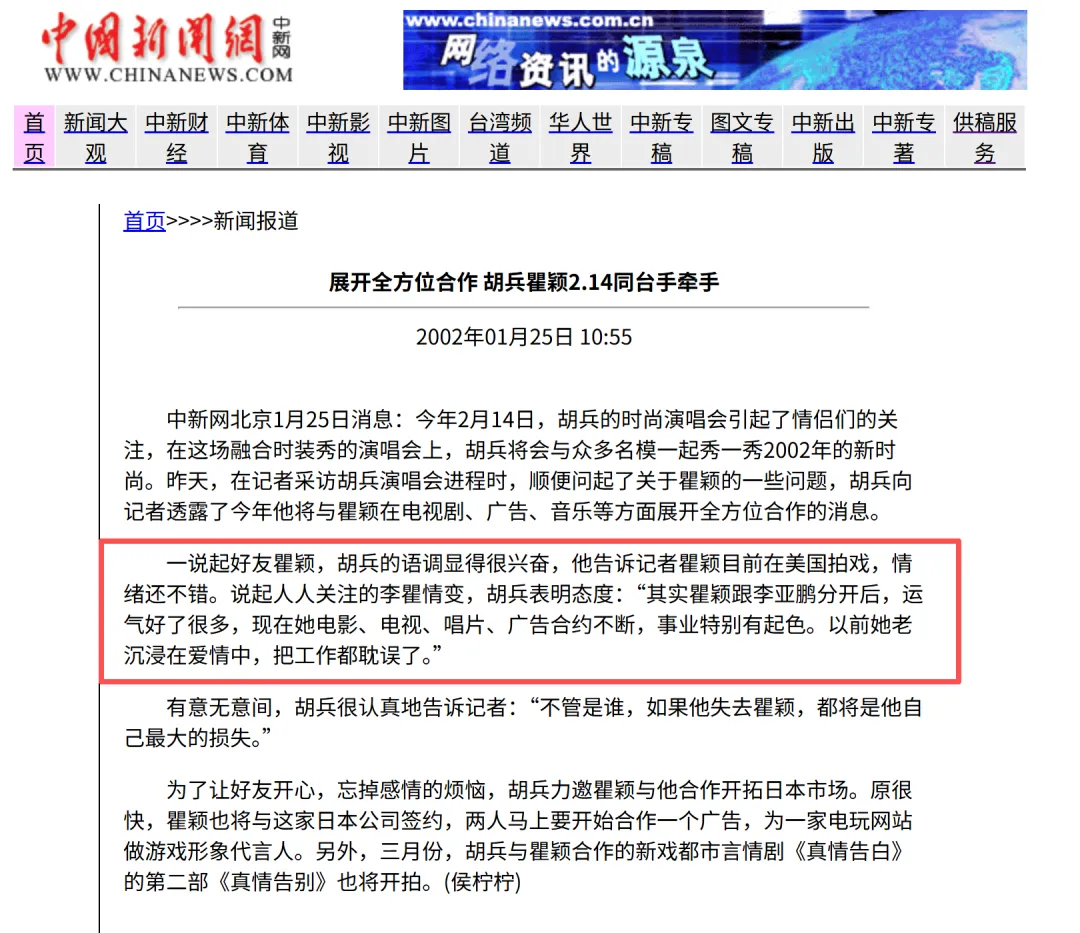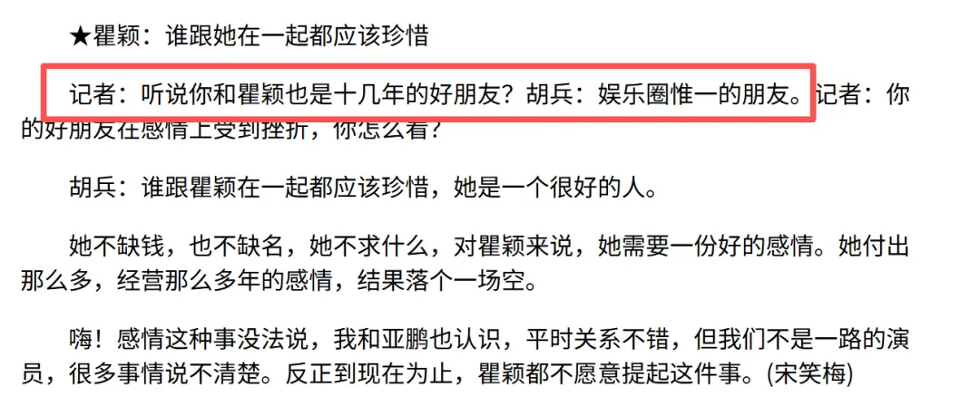 两人相识于1991年的模特大赛,是当时模特圈仅有的两位能站上国际 T 台的中国面孔。两人每次合体走秀,胡兵永远会主动帮瞿颖整理裙摆、核对流程。有记者问他,听说你和瞿颖是十几年的好朋友?胡兵回答:娱乐圈唯一的朋友。(《说时尚说感情说绯闻 在杭州和胡兵零距离(图)》来源:2002年《中国新闻网》报道)1995 年瞿颖意外坠马受伤,胡兵连夜联系德国骨科专家进行跨国会诊,带着专家跨省赶到医院,并推掉所有工作陪护,这是他第一次萌生表白的念头,但无奈瞿颖当时的男友是罗中旭。两人拍《真情告白》时期,全国观众都在嗑两人真cp,胡兵也一样。但还没等胡兵表白,瞿颖探班李亚鹏的消息就登上了头条。胡兵在节目上还把这段拿出来自我调侃,两个人当时在香港逛街,瞿颖让他试衣服,他高兴坏了,以为瞿颖是买给自己的,结果下一秒,瞿颖说,换小一码(买给李亚鹏的)。用胡兵的话来说,就是“总是在筹备过程中就夭折了”。有人会怀疑,俩人是不是故意炒作,但是,事实胜于雄辩,爱久才见真心。瞿颖和李亚鹏告吹时,一向低调的胡兵,公开发言抵制男方,“其实瞿颖跟李亚鹏分开后,运气好了很多”这种话,现在看来都很带情绪。想来,瞿颖第一时间,花2000块打车也要去找胡兵哭诉,一定是他给到了巨大的安全感。和张亚东分手时,胡兵推掉了海外的所有工作,帮她处理房子、搬家等一系列琐事。瞿颖每次事业有新动态,胡兵都要第一时间打call。瞿颖每年生日,胡兵雷打不动送祝福,有时还陪她一起过。瞿颖后来在李静的播客里公开说:“我人生最难的时候,第一个想到的人永远是胡兵。”瞿颖定居泰国清迈后,家里特意给胡兵留了专属房间,钥匙就挂在床头,胡兵随时去都能住;胡兵在北京的房子,也给瞿颖留了位置,不管她什么时候来,都有地方落脚。翻翻胡兵的微博,隔三差五就要@瞿颖,爱意简直藏不住。去清迈找瞿颖,胡兵连发三条,每一条都要强调“我在清迈”,我真的要笑出屏幕。很多人质疑过胡兵的取向,这件事,他已经在很多场合澄清过。以及话说回来,都这个年纪了,任何人长久地对另一个人好都是意外,取向不取向,真的不太重要了。但胡兵不是没表白过,除了采访中的大方认爱之外,私下里,胡兵也表白过。2005 年,两人一起坐飞机飞哈尔滨,胡兵突然很认真地跟瞿颖表白:“我喜欢你很多年了,憋在心里十几年,我从头到尾都是超级喜欢你......”瞿颖当时的反应是,一边哭,一边打他说,你为什么不早说。但两人坦诚一番之后,最终的结果还是,胡兵被瞿颖“残忍地拒绝了”。