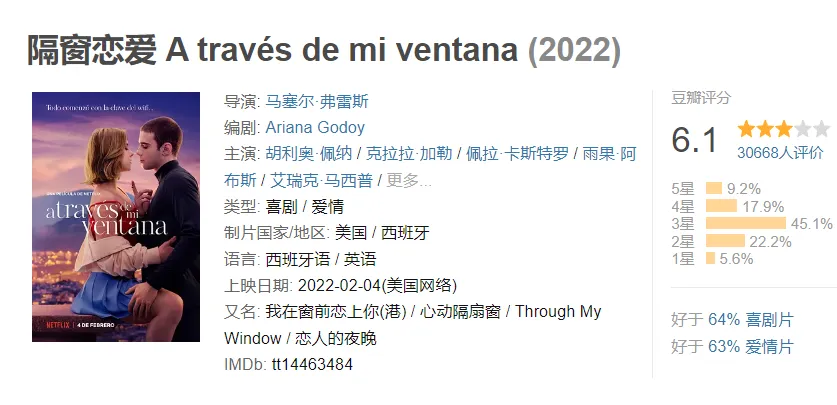 一切从 Wi-Fi 密码开始。蕾凯儿一直暗恋著俊俏的邻居阿烈斯,常常偷看他,却从没跟他说过话,这样有办法夺得美男归吗?《我在窗前恋上你》改编自 Ariana Godoy 的小说,将于 2022 年 2 月 4 日在 Netflix 首播。2022年2月6日 终于看完了!西班牙就是帅哥多啊!!! 前期的试探 后期的奔放 俩人的感情线虽然有些不太理解 但抵不住男主的帅和身材啊!当女主的巫婆装扮遇上男主的希腊之神cos,我真的心动了!男主那个造型真的绝了!!!男女主实在是配啊!就是西班牙版的after吧帅哥坚实的肌肉,靓女坚挺的扔子头观赏性极佳;看两个早就暗生情愫的两个少男少女互撩,一套一套地还整挺好,荷尔蒙快要溢出屏幕,不由得一个劲儿感叹:青春小鸟一去不回来,年轻真好~ 你看那些吹毛求疵的,还艺术审判上了,我看你们是羡慕嫉妒恨!想看剧的剧迷不要错过