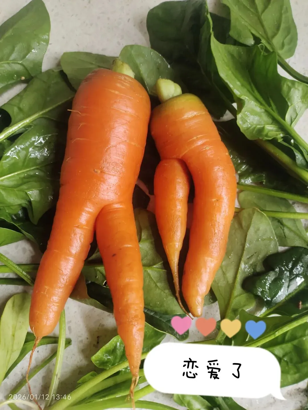 我一翻,好家伙,竟发现了一对特别的胡萝卜,模样像极了恋爱中小情侣!