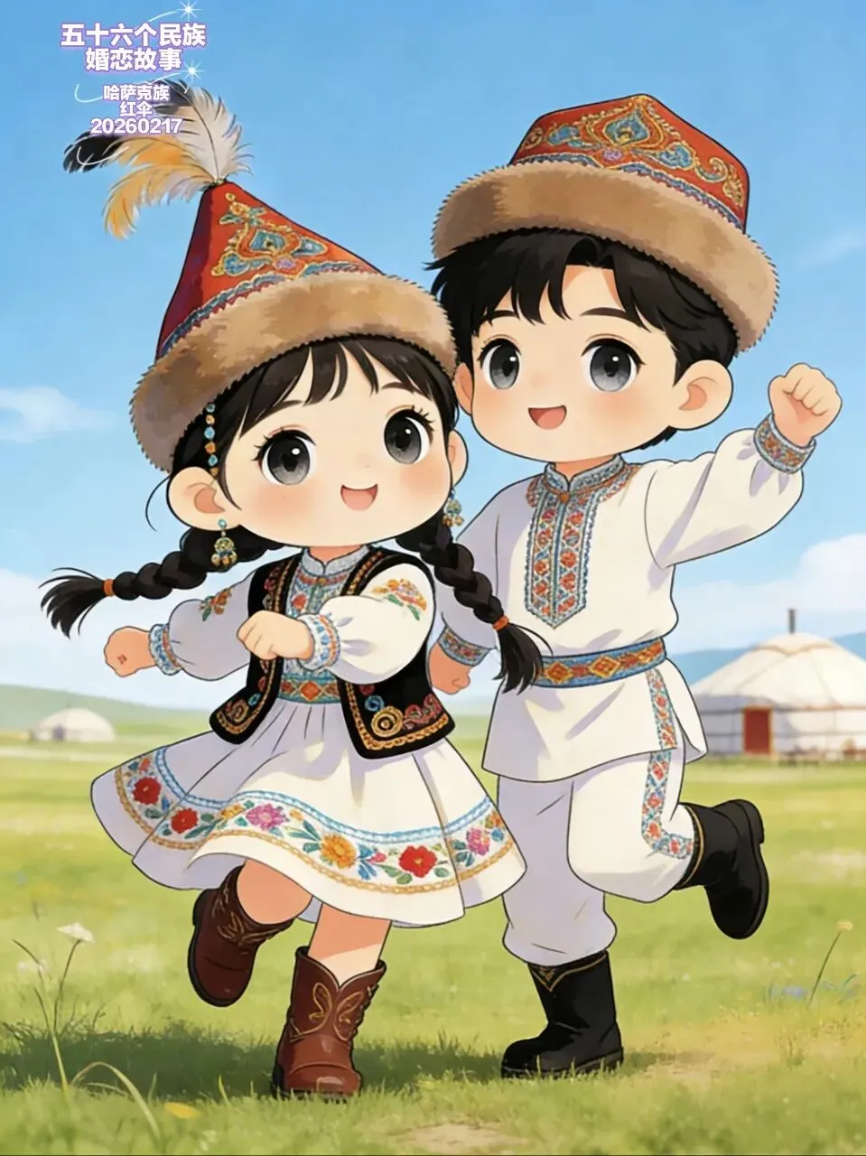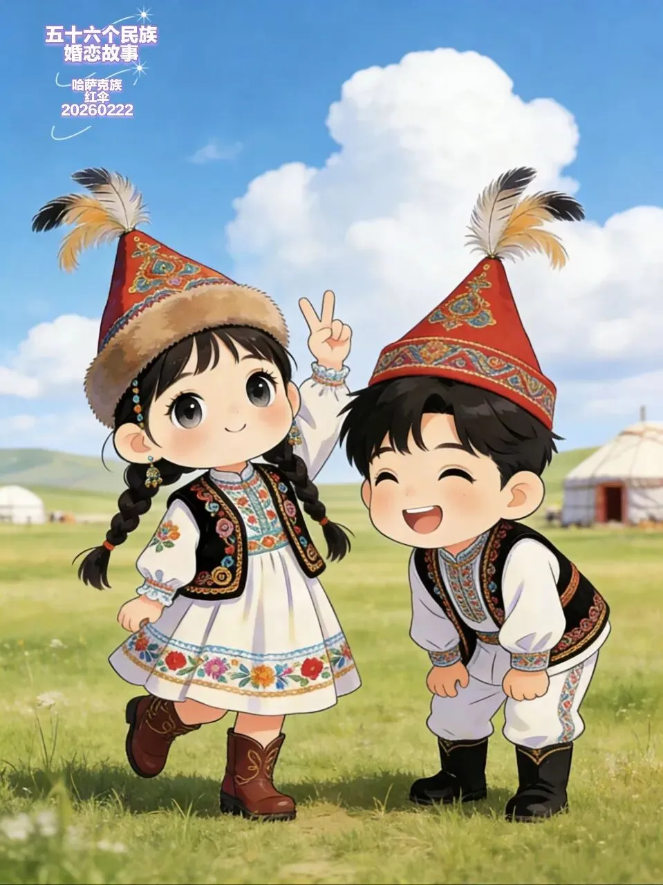 如今,阿依努尔和巴合提的毡房里,总能听到悠扬的歌声。他们的孩子戴着小小的鹰羽帽,在草原上奔跑,听着父母讲当年的故事。草原的风依旧在吹,却永远带着这对恋人的歌,在阿勒泰的山川间,代代相传。