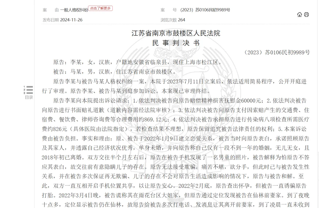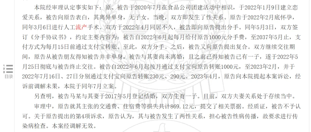 - 签订协议:双方曾因恋爱事宜多次吵架,且双方签订《分手协议书》,约定马某每月支付“分手费”。但事后马某又求复合,继续隐瞒已婚事实。