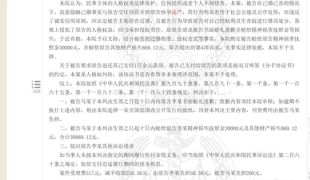 李某(女)与马某(男)于2022年1月建立恋爱关系。交往期间,马某自称离异单身、无子女,并向李某承诺未来。然而,在交往过程中,李某逐渐发现马某不仅已婚,且育有一子,其所谓的“离婚”纯属谎言。且在恋爱过程中,李某怀孕并流产,后李某发现马某多次欺骗自己,李某最终选择与马某分手,并将其诉至法院,要求马某就其欺骗行为承担侵权责任。法院经审理,最终判决马某向李某书面赔礼道歉,并赔偿精神损害抚慰金及其他财产损失共计3万余元。【原告诉求】