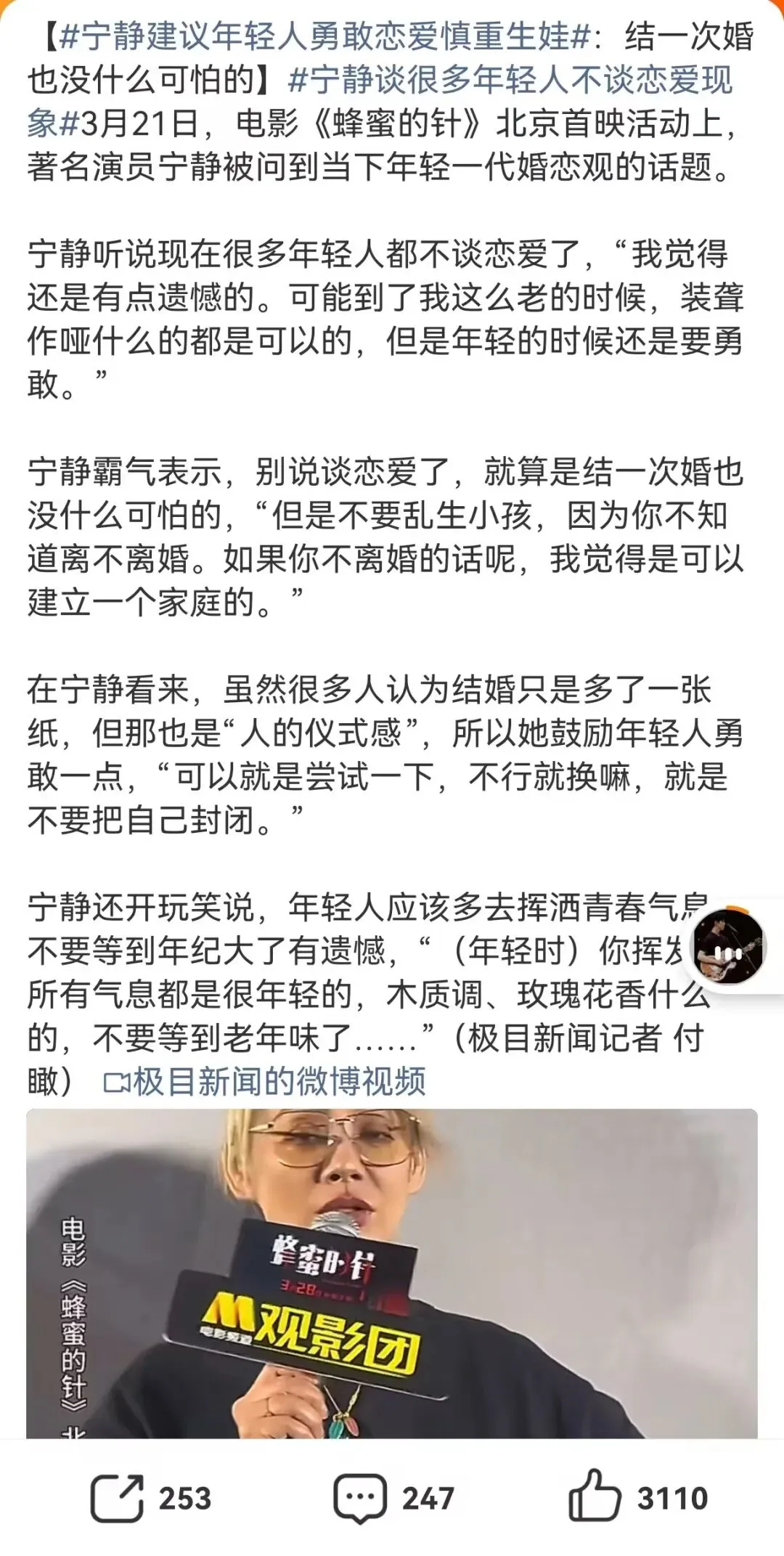 3月21日,宁静在电影《蜂蜜的针》北京首映活动上被问到当下年轻一代婚恋观的话题。