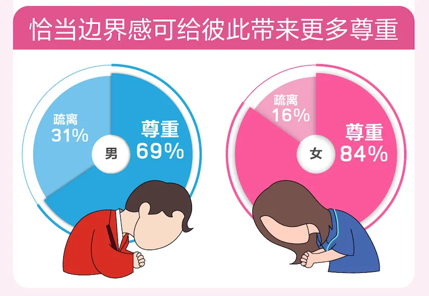 事实上,“边界感”的存在,并非是刻意的远离,而是在适当的距离中,给予对方相互的尊重和理解,进而保持良好的情感关系。正如《报告》中所展示,大多数单身认为合适、恰当的边界,会在相处过程中给双方都带来更多尊重,持这一观点的男性占比近七成,女性超八成。边界并非只有防御,也可以是友好的,而友好的边界,就是把对方放在心上的态度和考虑对方感受的做法。
