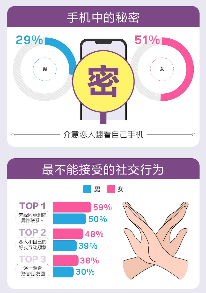 每个人都是独立的个体,都期待拥有自己独立的私人空间,并不希望对方过分干涉。《报告》显示,“未经同意删除异性联系人”、“恋人和自己的好友互动频繁”、“逐一翻看微信/朋友圈”,占据了最不能接受恋人社交行为排行榜的Top3。