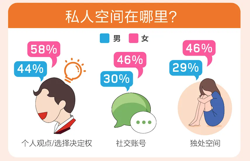 每个人都拥有属于自己的隐私,他们不希望被人发现或者干预,那么哪里才是属于自己的私人空间呢?《报告》显示,“个人观点/选择决定权”是单身认为最重要的私人空间,能够自由表达自己的自由与观点;此次,社交账号、独处空间也被单身们列为最为重要的名单中。