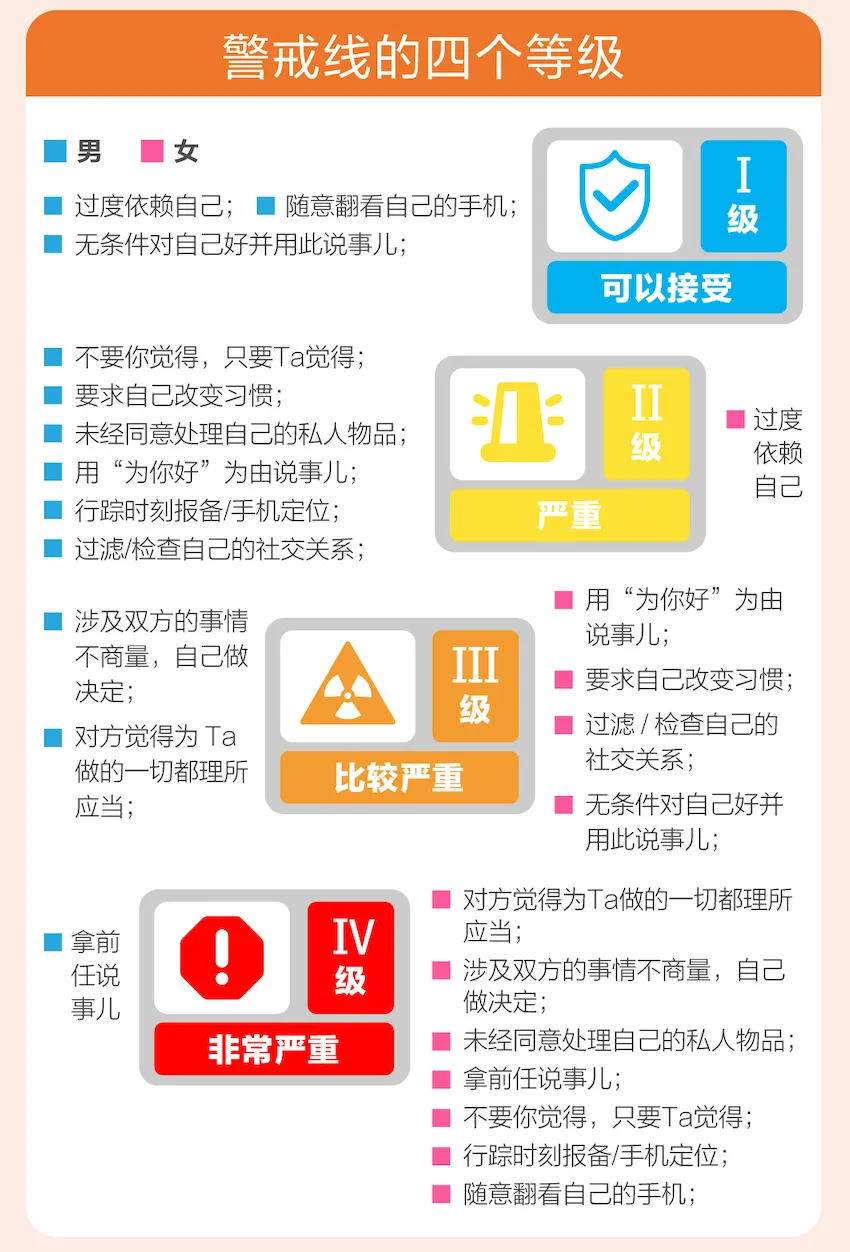 只要一不注意,恋人间便容易越过边界,触碰到警戒线。在爱情警戒线的分级中,男女双方呈现了倒置现象。《报告》显示,警戒线等级越低,单身男性的警戒行为越多,女性则完全相反。