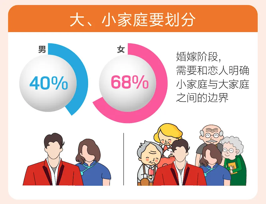 随着从恋爱过渡到婚姻,双方从大家庭之外,蜕变组建新的小家庭。此时,大、小家庭的边界划分,又将如何划分?《报告》显示,婚姻不只是两个人的结合,也意味着两个家庭的结合。四成单身男性和近七成单身女性认为,婚嫁阶段需要和恋人一起明确小家庭与大家庭之间的边界。在此认知中,女性明显高于男性。