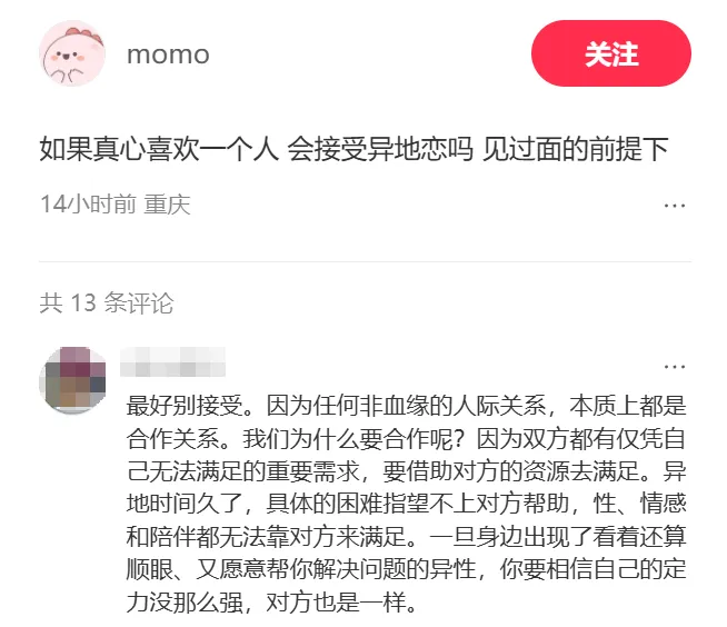 我在下面回复到:如果我们把恋爱仅仅看作一场“合作”,一种纯粹的“向外求”,那么无论是不是异地,失望恐怕都是早晚的事。即使是关系再紧密的恋人,也不要时刻指望别人来替自己解决问题。