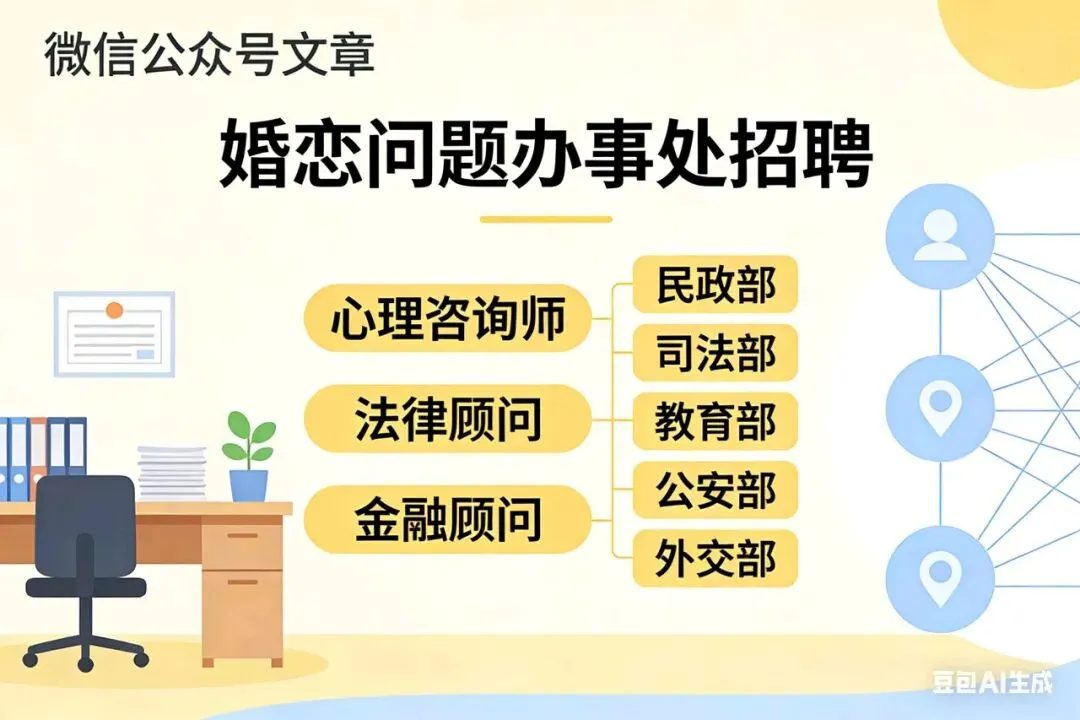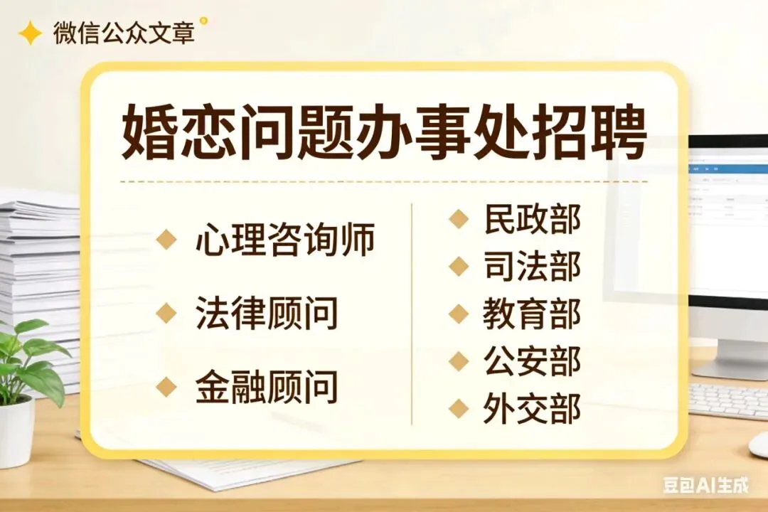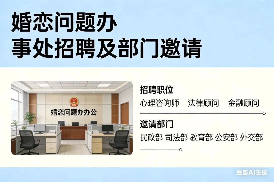 为进一步夯实专业力量、深化部门协同、提升服务质效,现面向社会公开招募专业人才,并诚挚邀请民政部、司法部、教育部、公安部、外交部等相关部门携手参与,共建权威、专业、温暖、可靠的婚恋服务体系。
