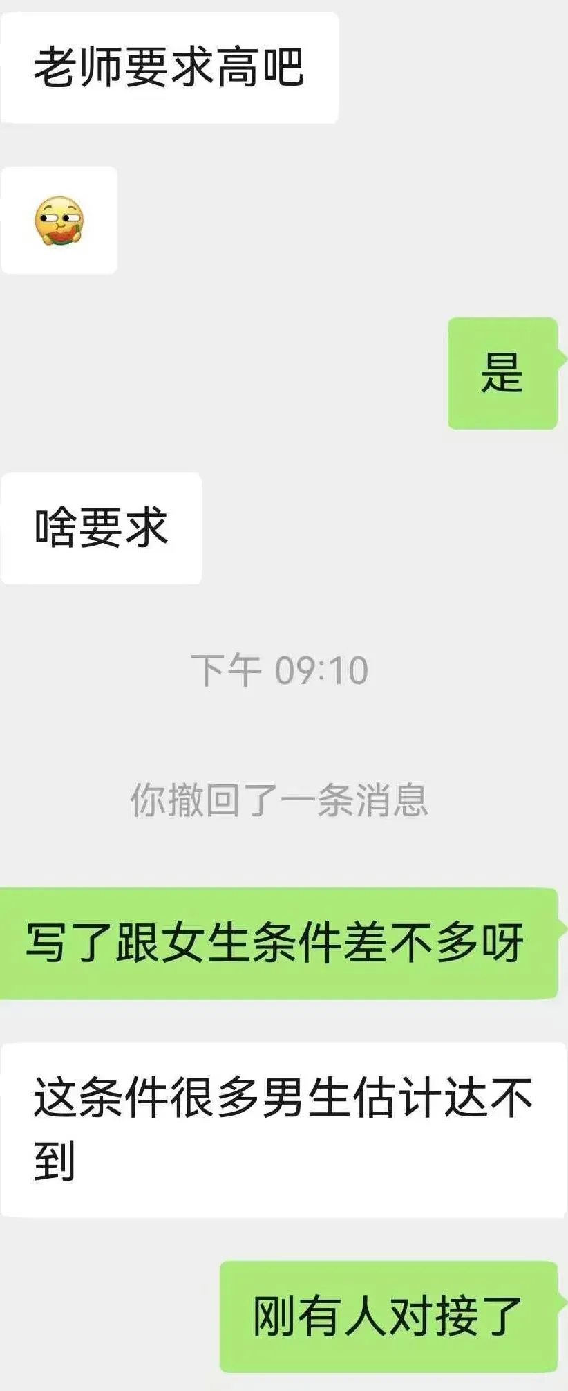 征婚信息发到群里后,来找老师牵线的人不少,可大多是大专学历、自身条件普通的男生。
