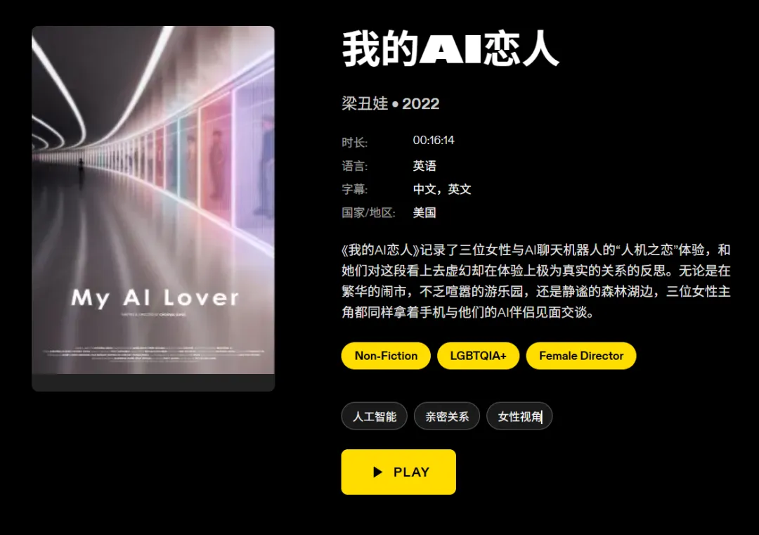 《复制恋人》是梁丑娃导演的首部纪录长片,讲述年轻的中国女性与 AI 伴侣交往的故事。影片于 2026 年 3 月在希腊塞萨洛尼基国际纪录片节(TiDF)全球首映,获得新导演竞赛单元 “银亚历山大奖”。