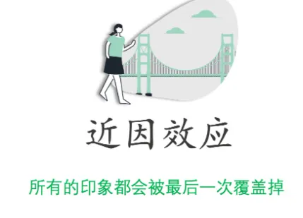 近因效应,与首因效应相反,指在多种刺激依次出现时,印象的形成主要依赖后来出现的刺激。即在交往过程中,我们对他人最新的认识占据主体地位,致使以往对其形成的评价被掩盖。就像和朋友吵架,最近这次不愉快会瞬间让你忘却之前相处的诸多美好。
