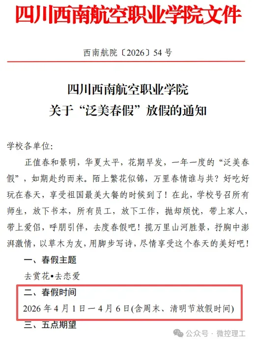近日,西南航空职业学院发布通知,该校将于2026年4月1日至4月6日放6天春假(含周末、清明放假时间)。