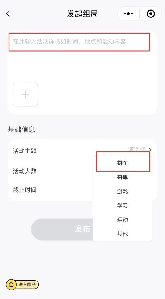 输入 拼车等关键词就可以找到其他同学的帖子、组局