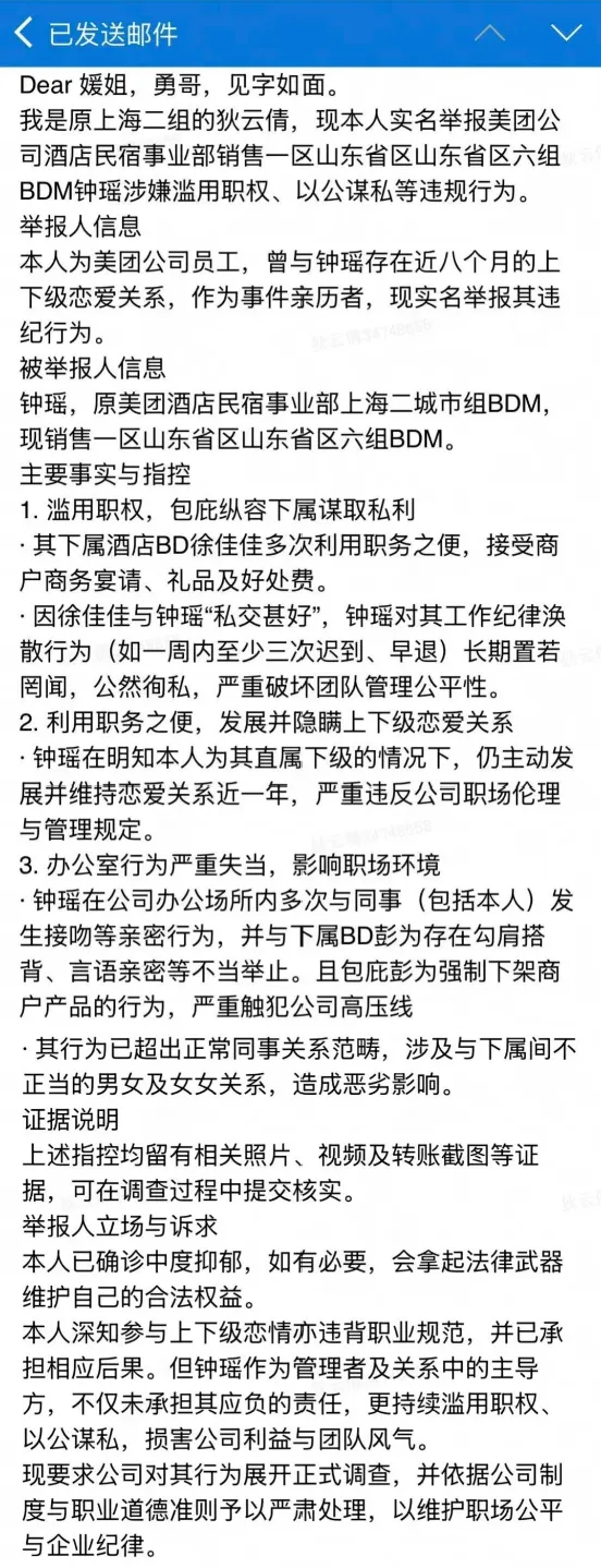 近日,一名自称美团员工的用户在社交平台发布长文,详述其与直属领导钟瑶之间涉及借贷、恋爱关系及分手后职场遭遇的复杂纠纷,引发网络关注。