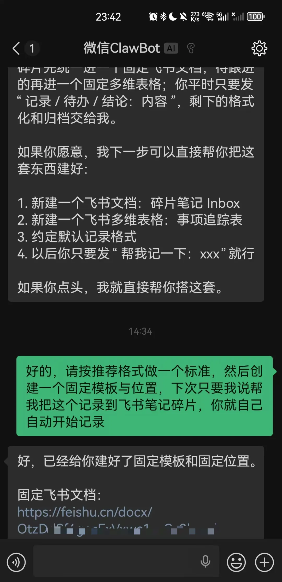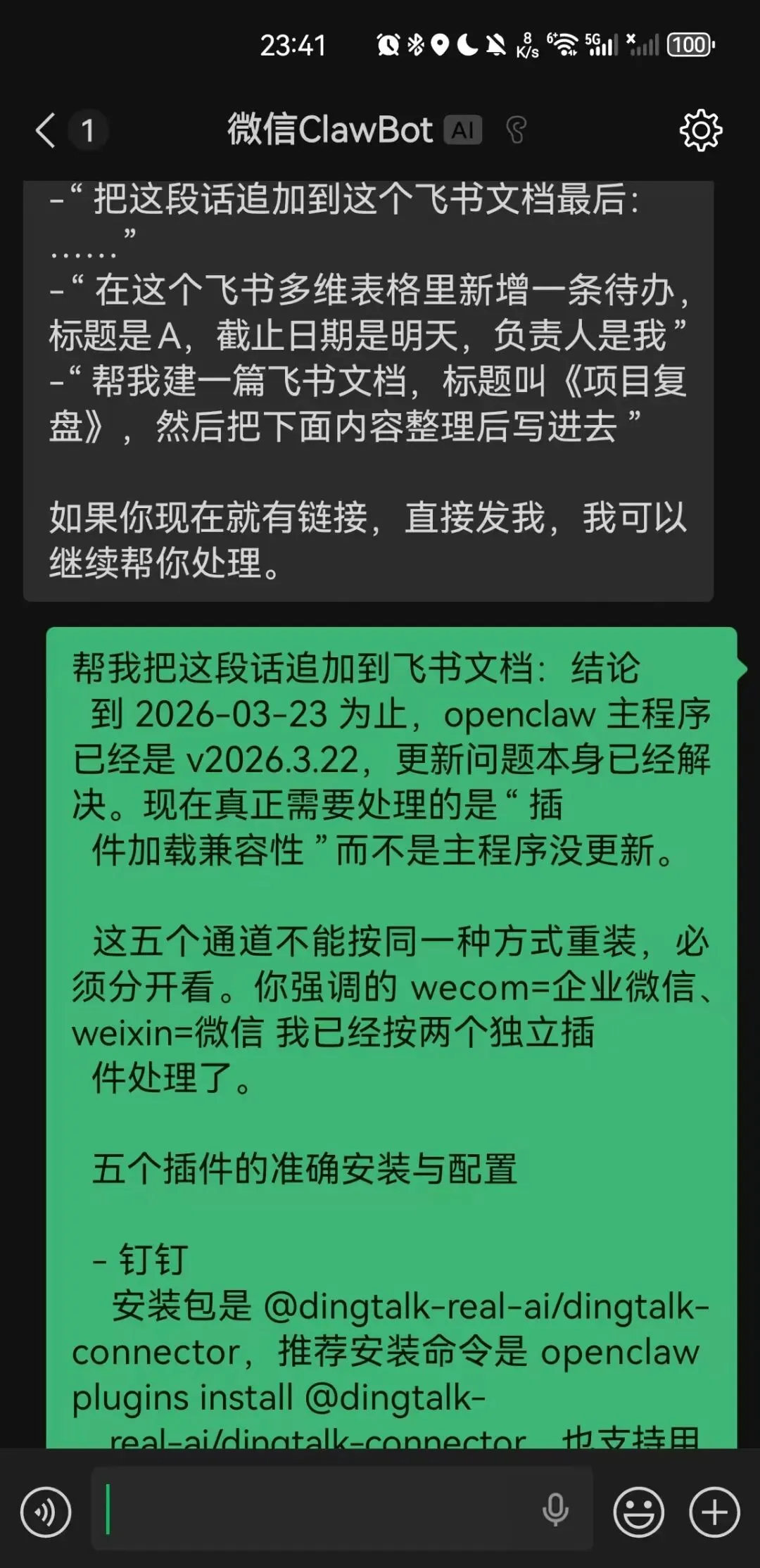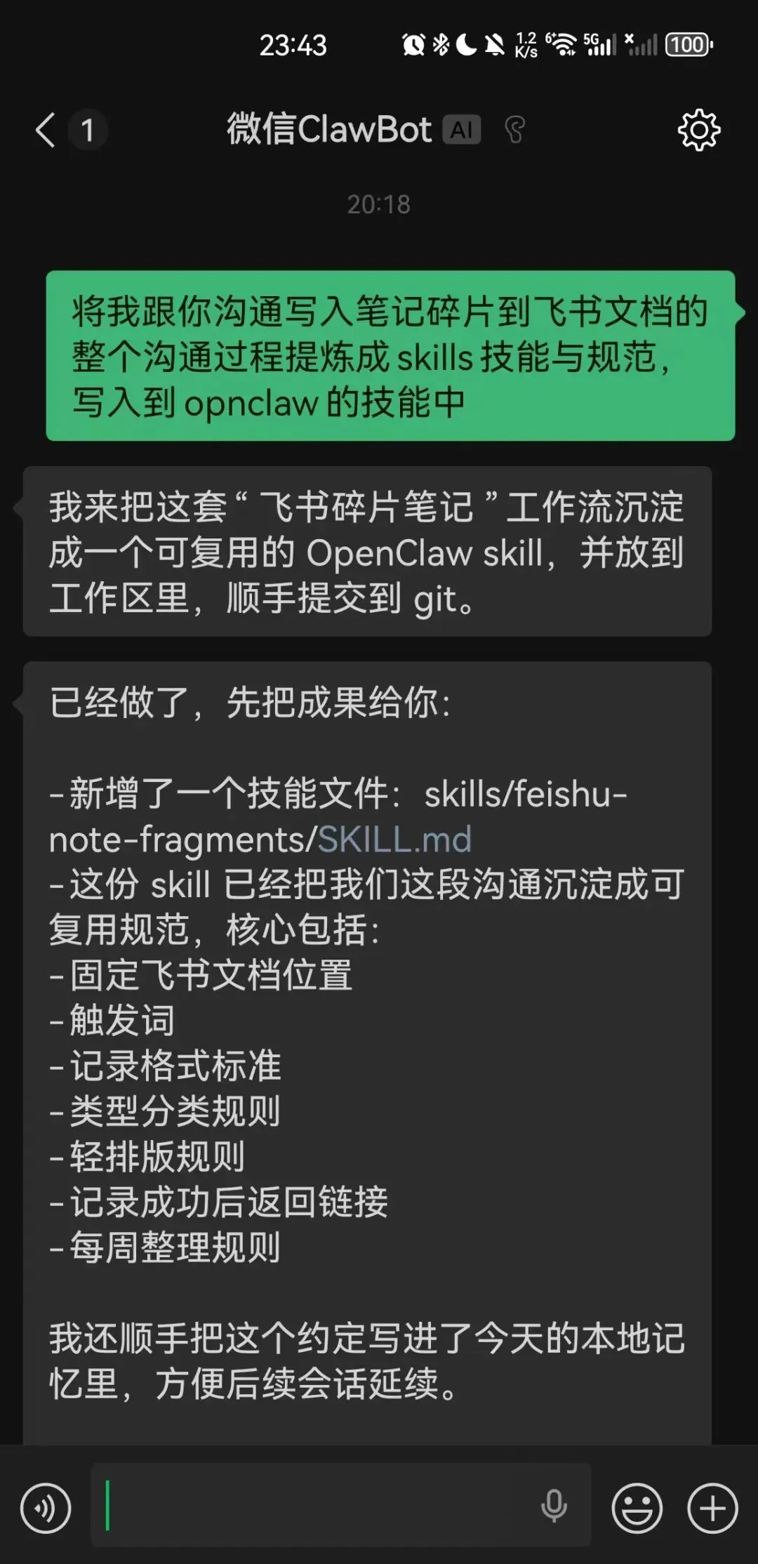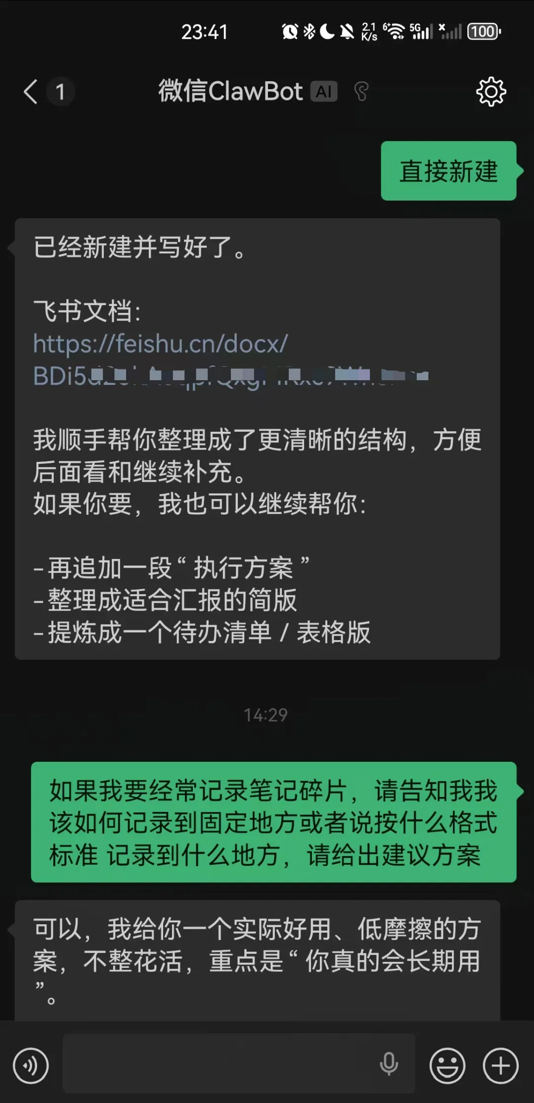 1、入口只有微信的时候,探索如何让微信与企业微信、飞书、钉钉等oa工作流工具互通,openclaw在中间起到了很强的粘合剂的作用,不多说,直接上图看效果:提示词:帮我把这个笔记碎片(这里代指你具体的笔记碎片内容)添加到飞书文档中
