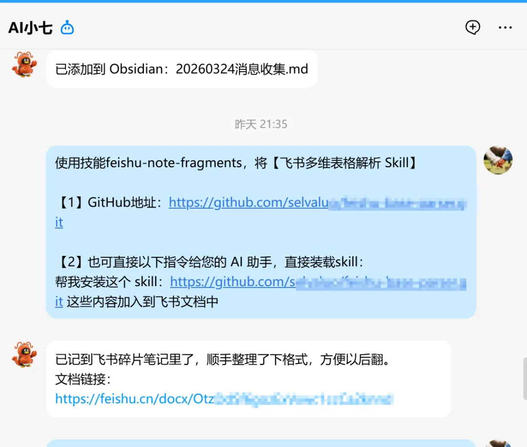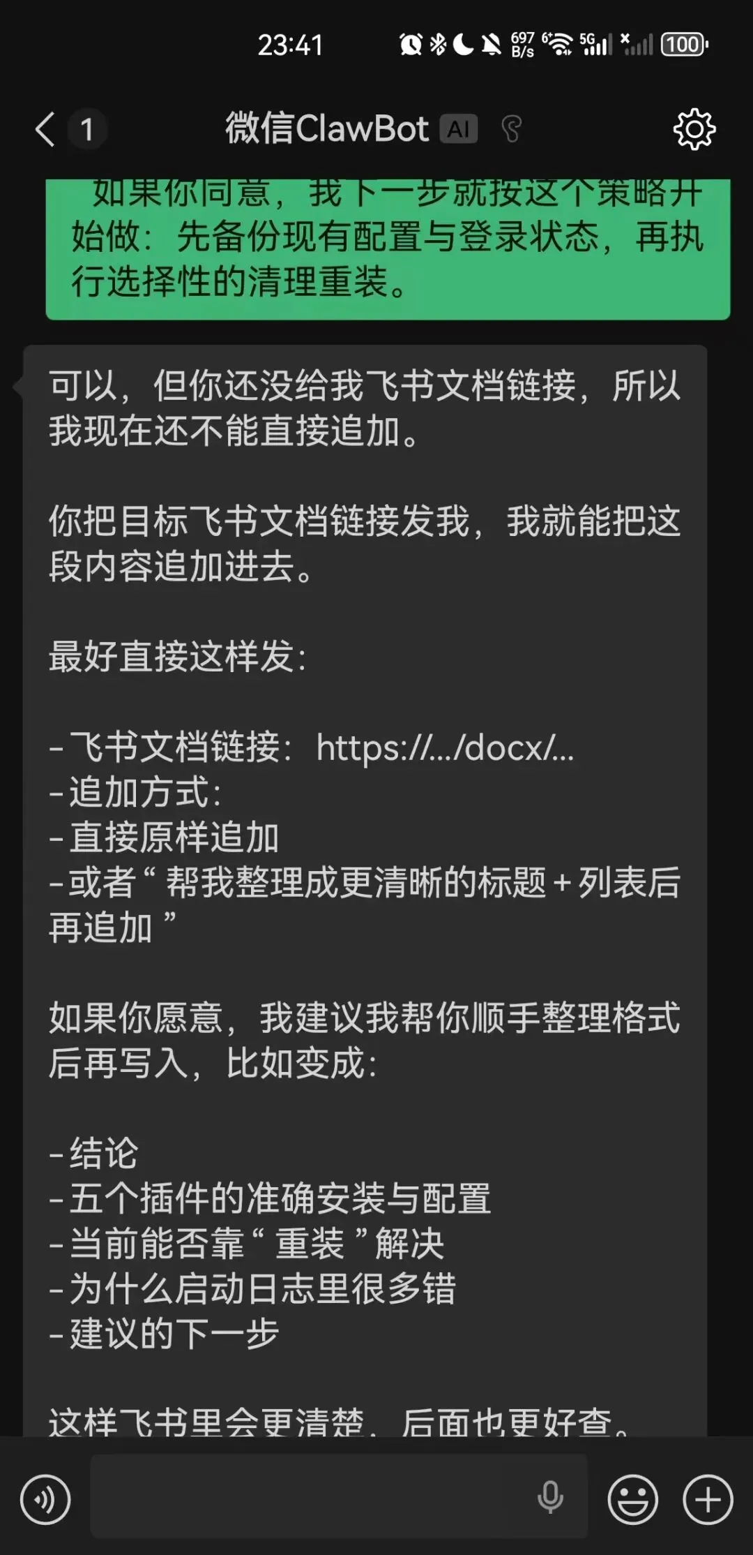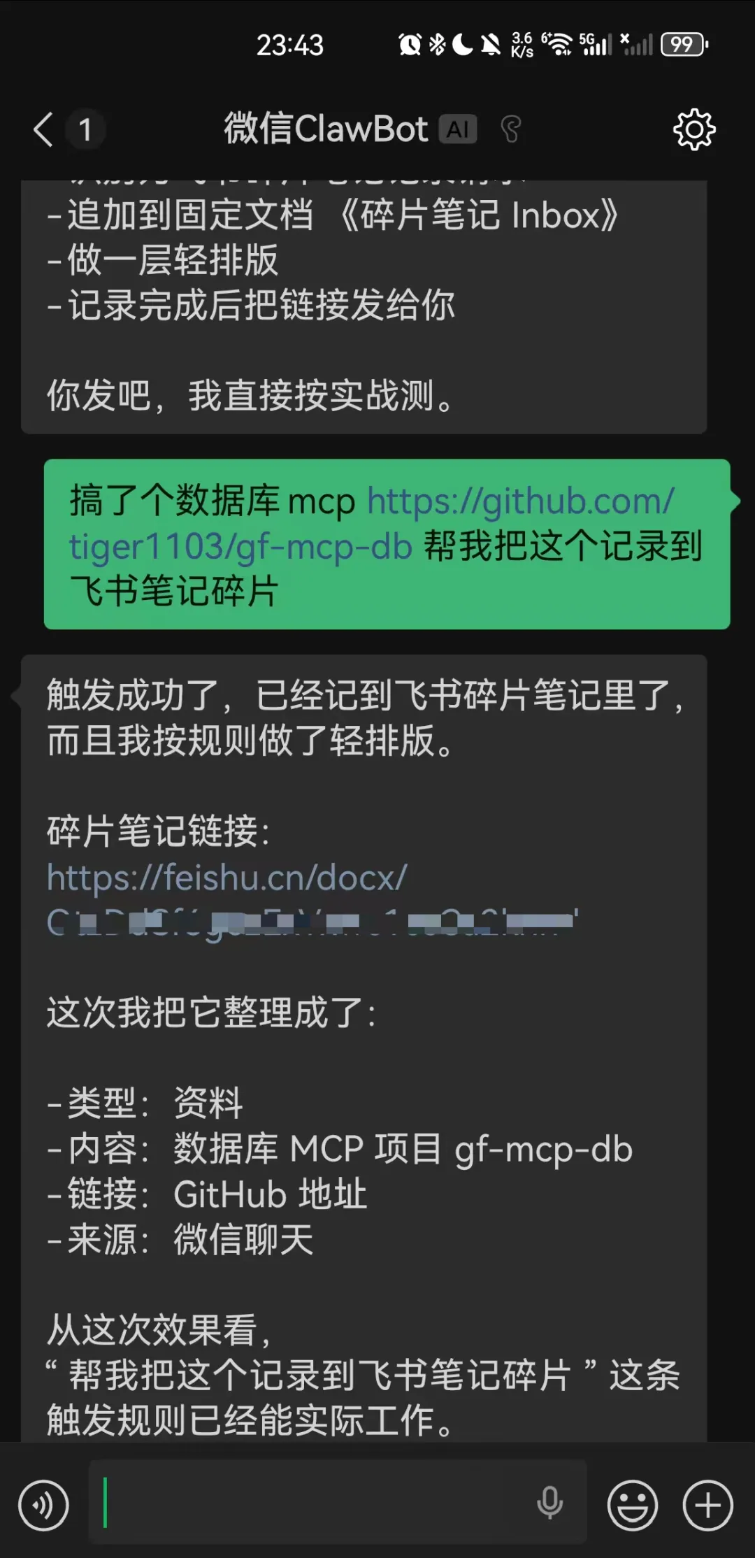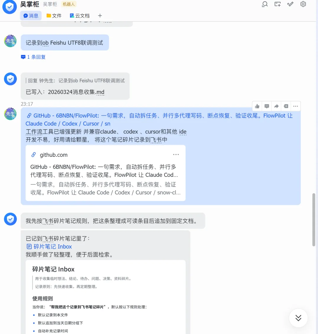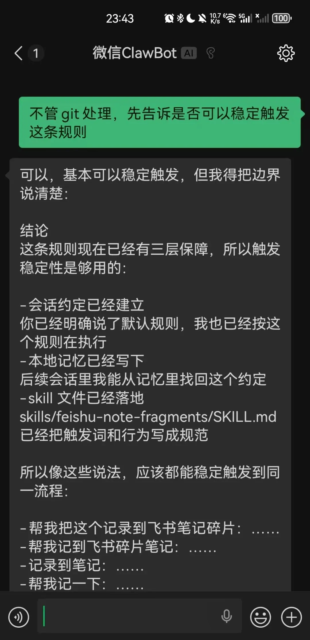 1、入口只有微信的时候,探索如何让微信与企业微信、飞书、钉钉等oa工作流工具互通,openclaw在中间起到了很强的粘合剂的作用,不多说,直接上图看效果:提示词:帮我把这个笔记碎片(这里代指你具体的笔记碎片内容)添加到飞书文档中