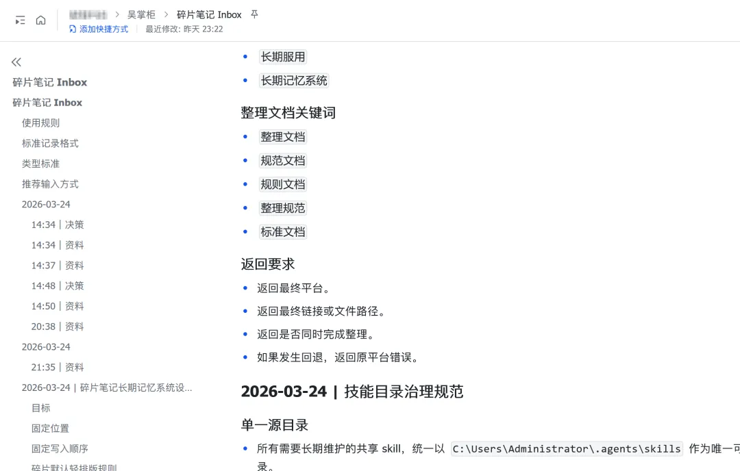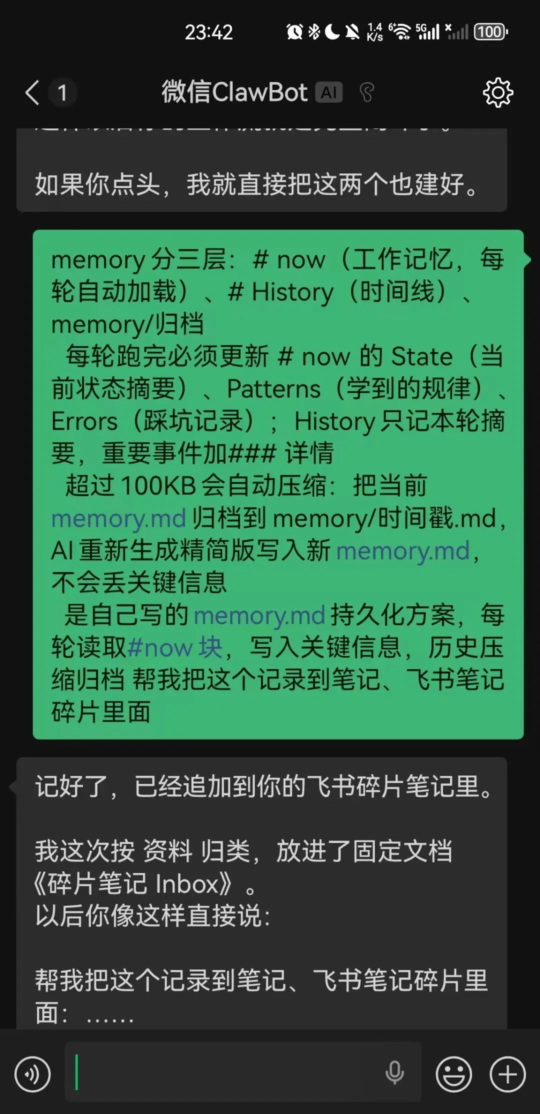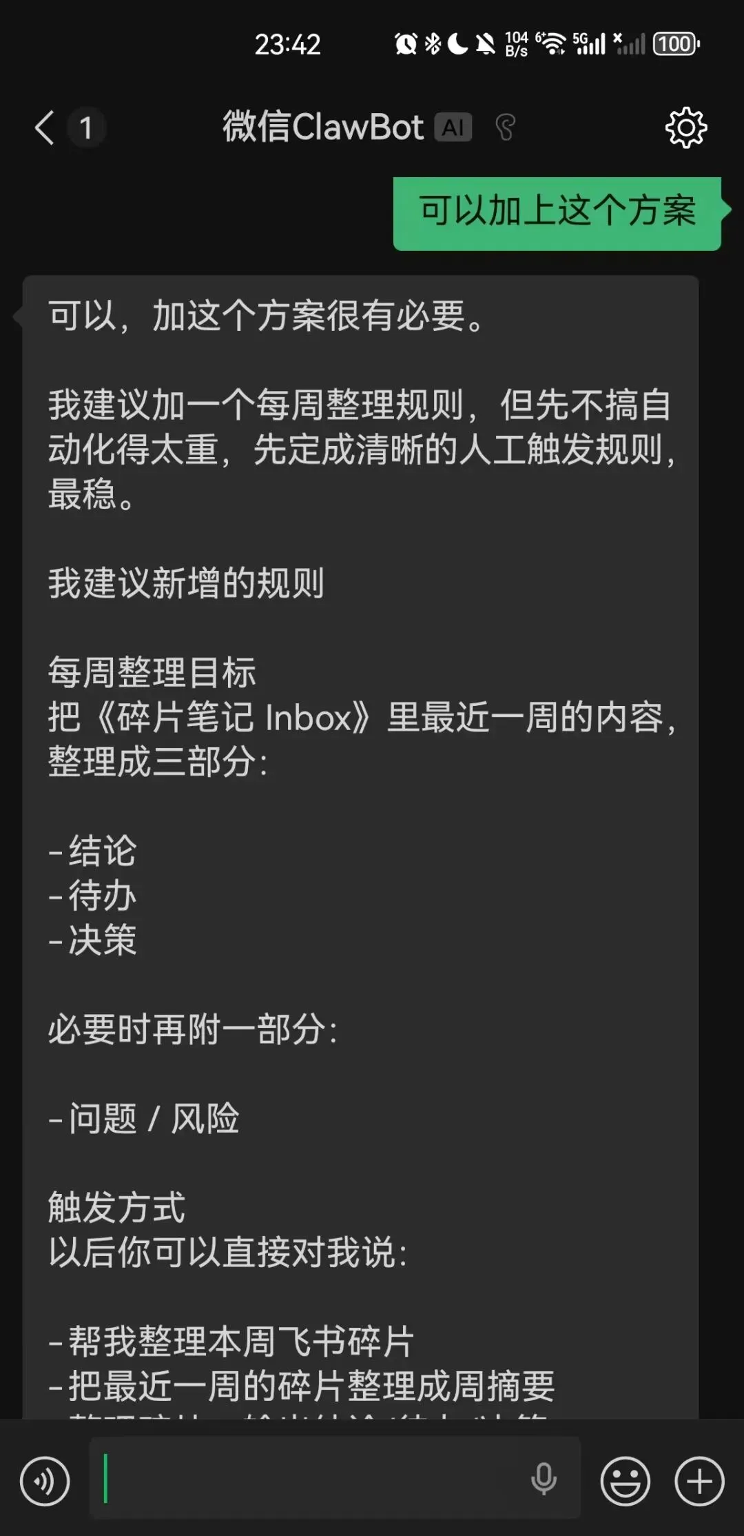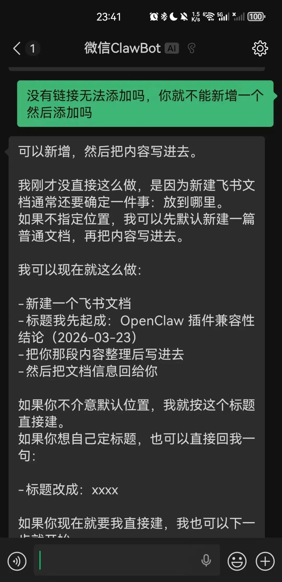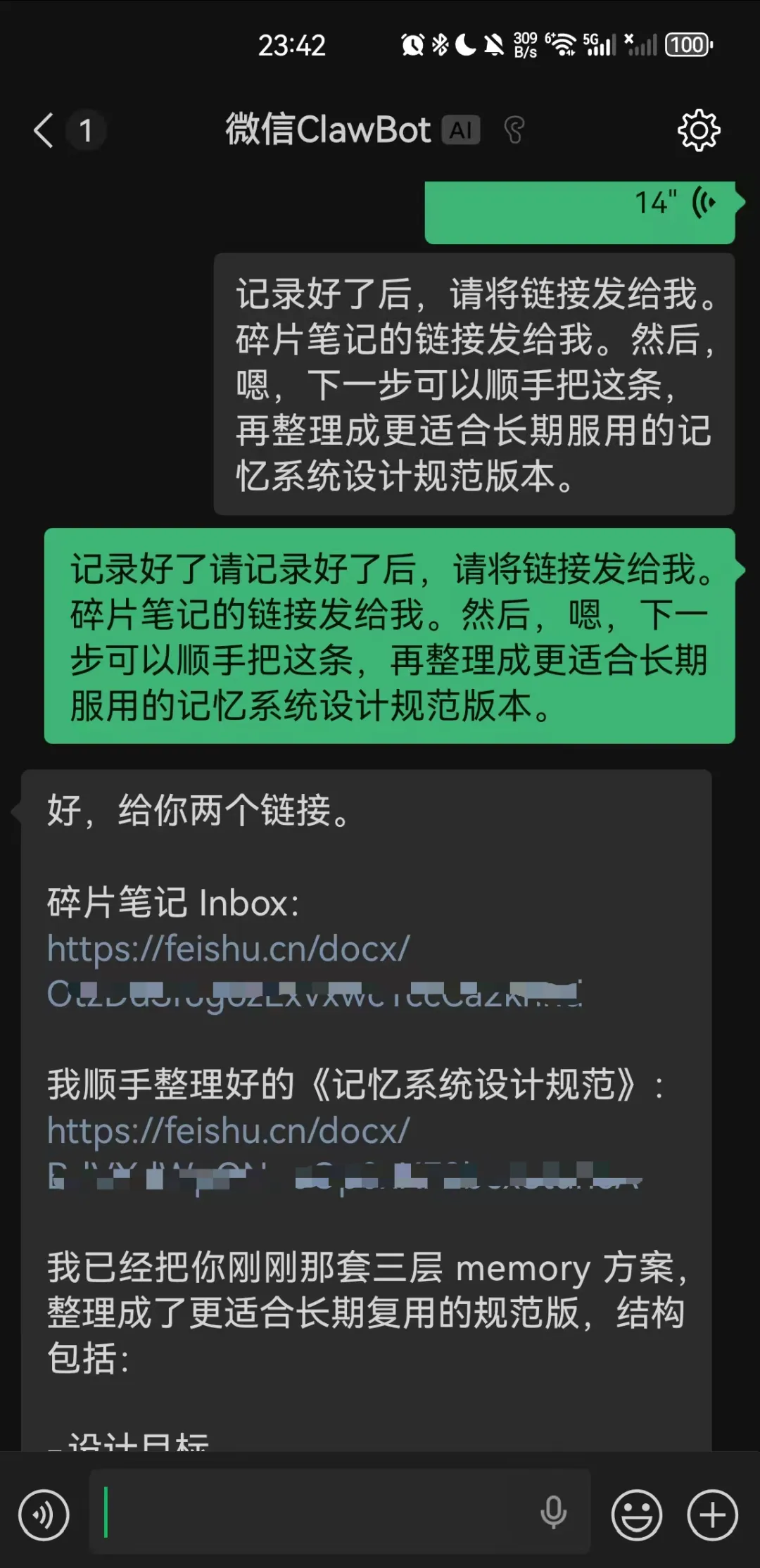 1、入口只有微信的时候,探索如何让微信与企业微信、飞书、钉钉等oa工作流工具互通,openclaw在中间起到了很强的粘合剂的作用,不多说,直接上图看效果:提示词:帮我把这个笔记碎片(这里代指你具体的笔记碎片内容)添加到飞书文档中