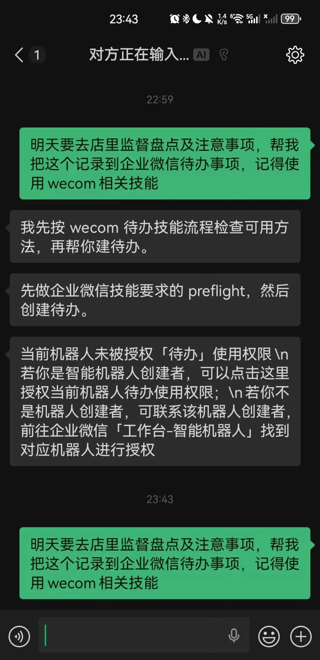 这里记录一下,应用中如果不给机器人权限,那么在聊天的时候是没法相应进行操作,所以无论是飞书、企业微信还是钉钉,在openclaw中插件机器人都要有相应的权限才能进行操作