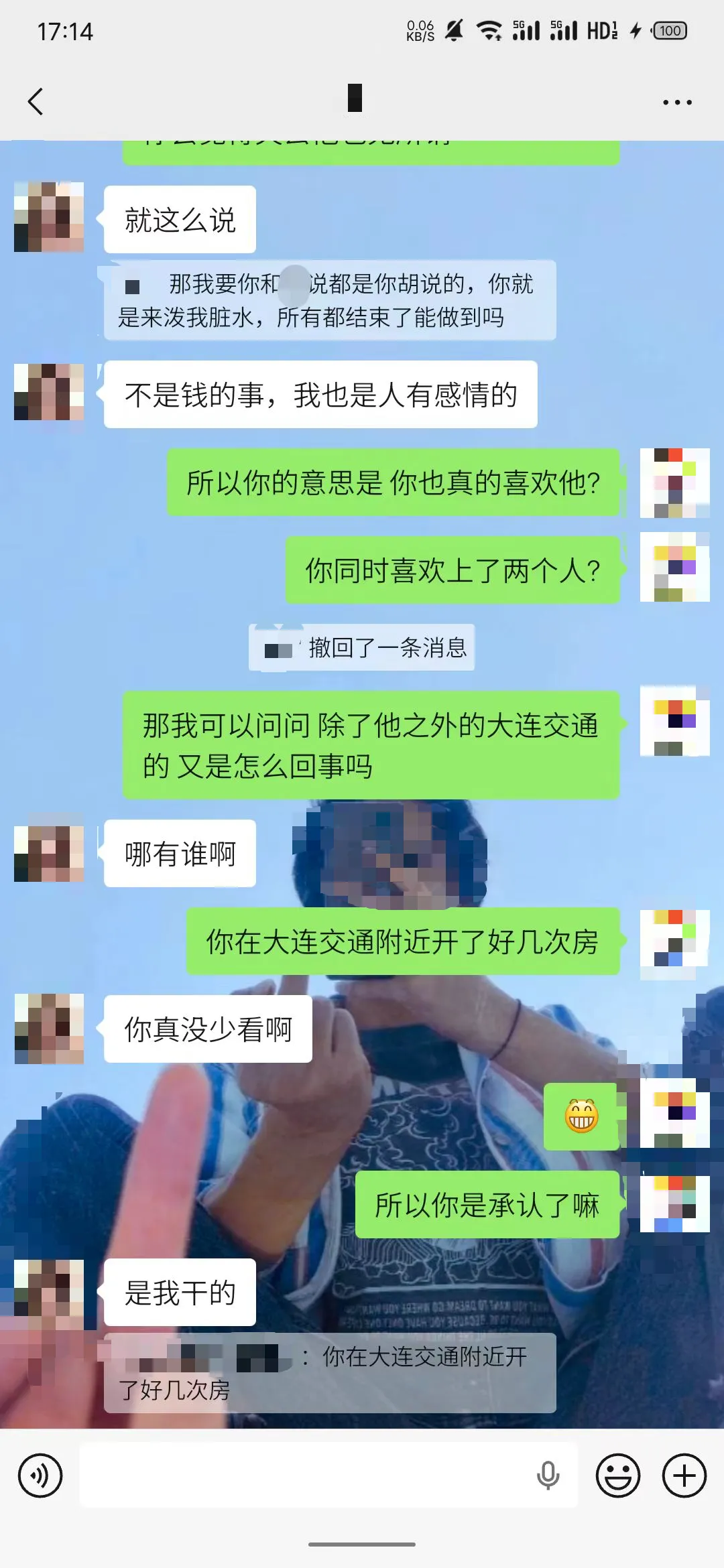 11月14日,我购票接女主回沈阳,在一起的时候我发现一直有人给她打视频电话,后来我查看了她的手机,发现女主早在旅顺那所学校谈了新男朋友,这期间几乎每次跟我吵架爽约,实际都是跟新男朋友相处去了。我发现之后,女主以自残、寻死要挟我,哭求原谅。