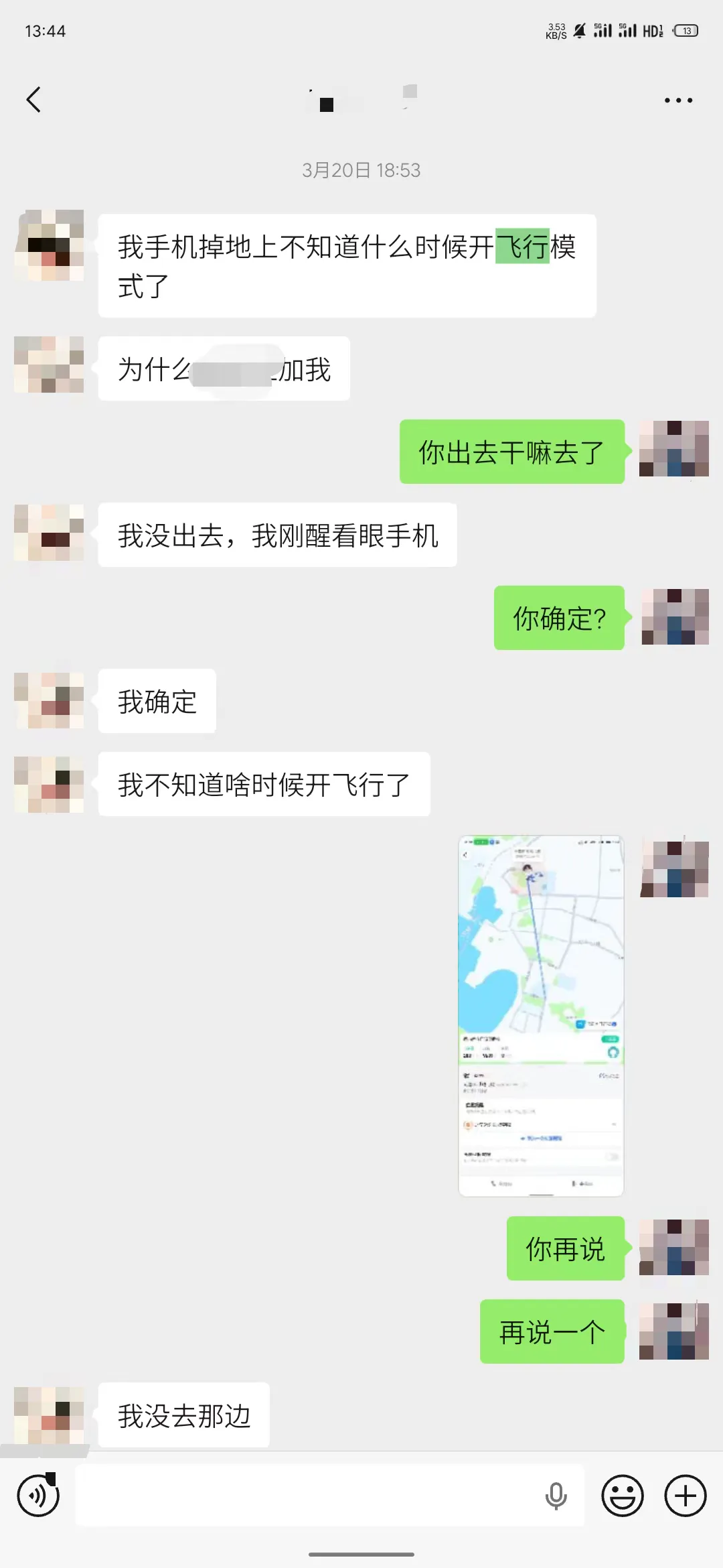 当天晚上七点多,我还是联系不到女主,于是我找了女主当时那个校内新男友,新男友否认他俩在一起,紧接着五分钟不到,女主就给我打电话了,说是在寝室睡着了,手机误触飞行模式导致高德地图定位关闭。