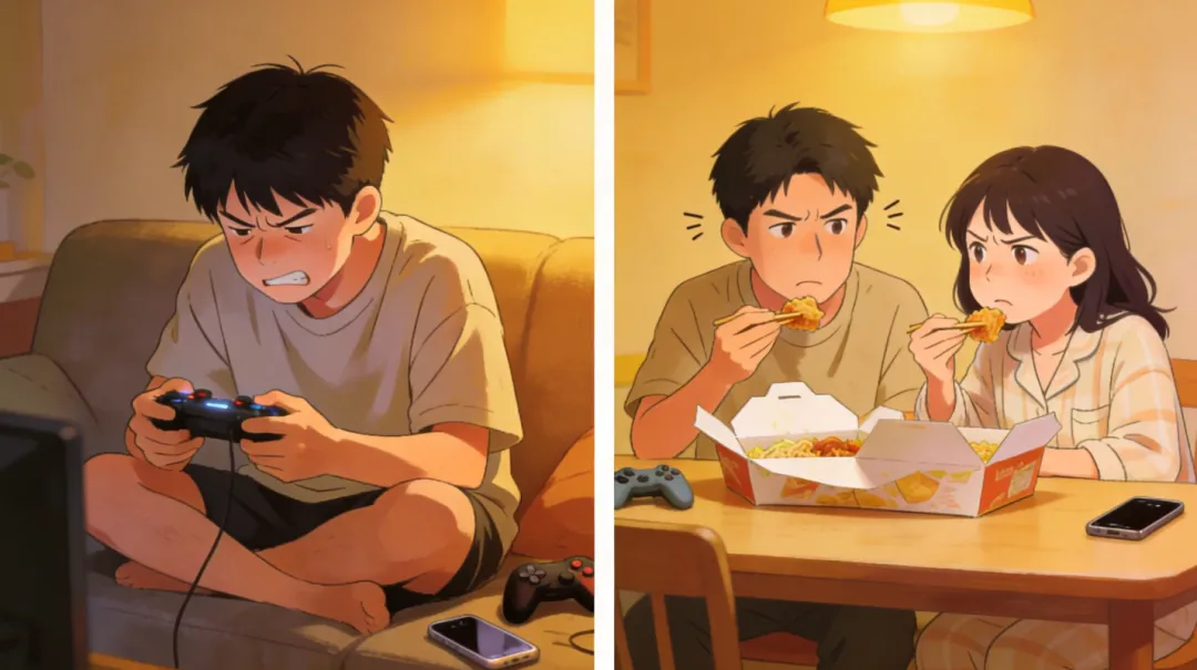 他也不用装作成熟稳重,打游戏输了会撇嘴抱怨,偶尔犯懒不想做饭,就点一份外卖分着吃