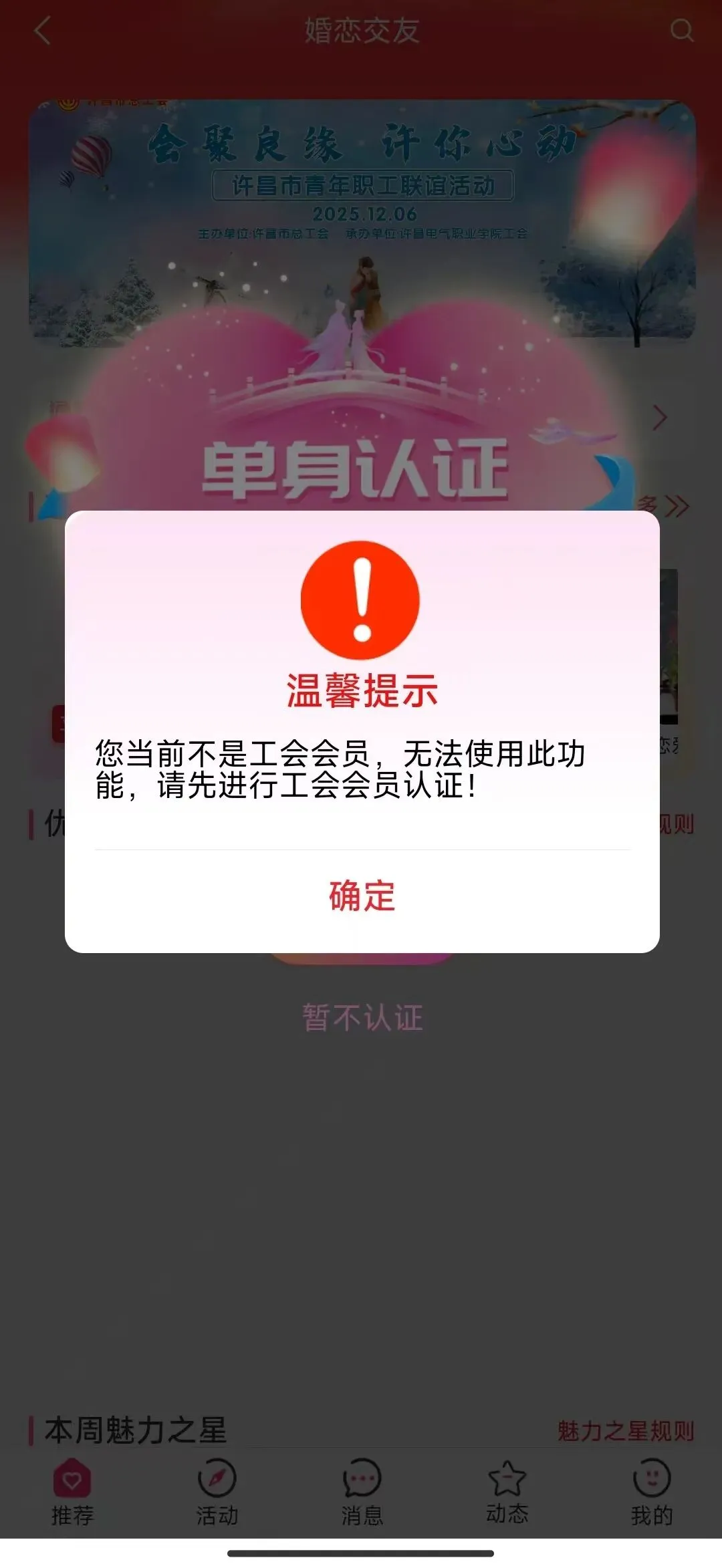 如果您还不是工会会员,点击进入婚恋模块后会提示进行会员认证,按照系统提示进行会员认证流程。