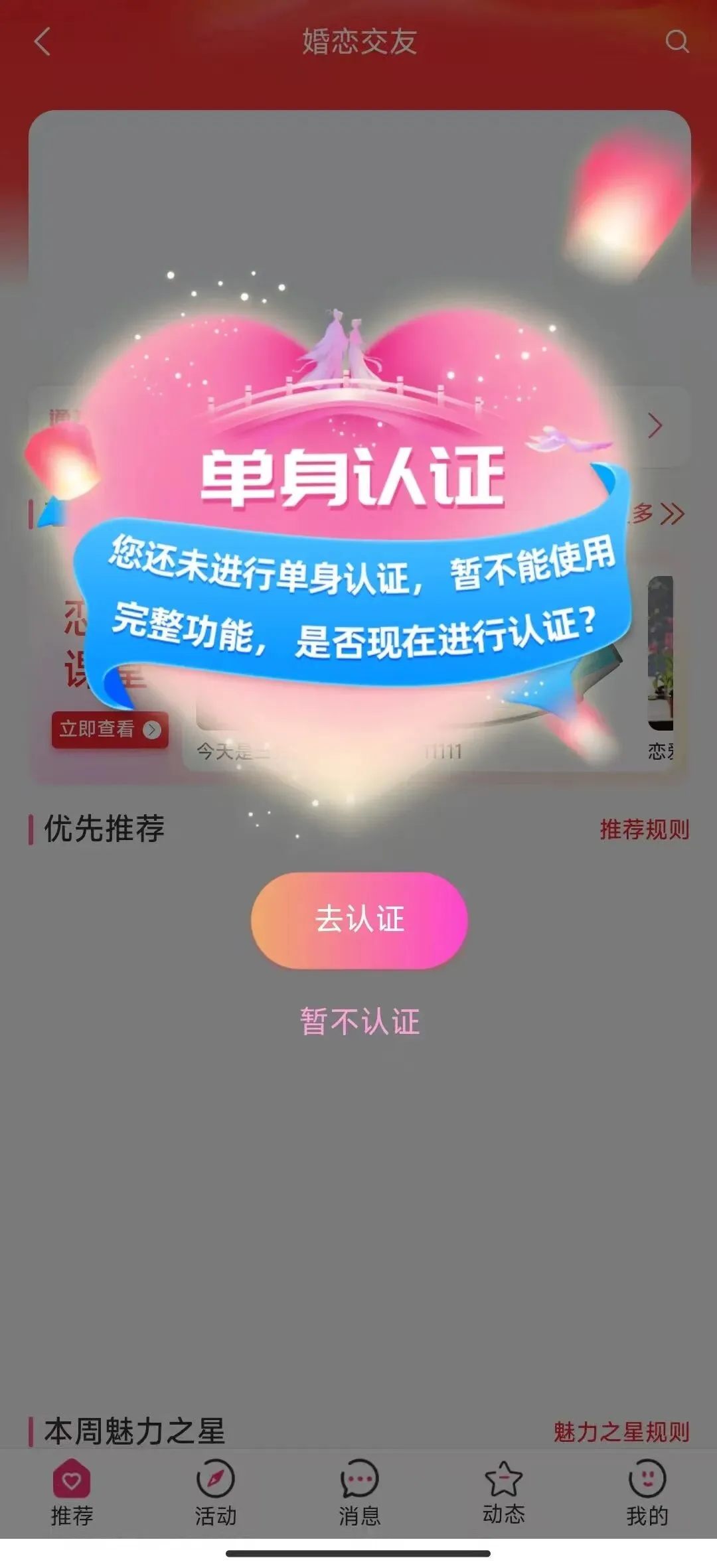 - 优先推荐:想快速脱单,让更多小伙伴们看到您、了解您,选择优先推荐,扣除魅力值,让交友更高效,更快遇见心动的人;