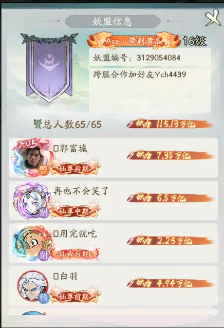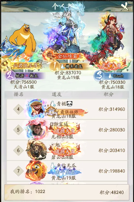 其他三个盟从排名上来看这一次没有怎么氪,主要是靠一个人数来对恋爱脑造成一个威胁。带刺黄瓜个人前10有2个:郭富城和再也不会笑了最终个人排名如下,佛系老龙,教主,C总都是拉满3天648礼包,并且最后还是拉了福泽的。
