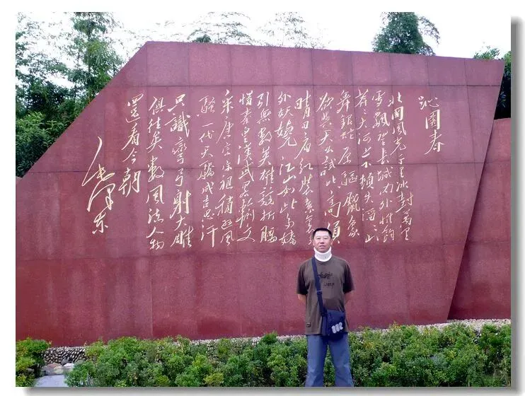 脖子里带着一个,腰里围着一个就这还看景呢真得是佩服死我啦 特意在主席的诗作下留影
