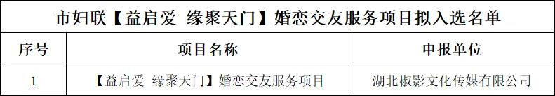 天门市妇女联合开展“益启爱 缘聚天门”婚恋交友服务项目,经组织申报、评审,拟确定湖北椒影文化传媒有限公司入选。现公示如下: