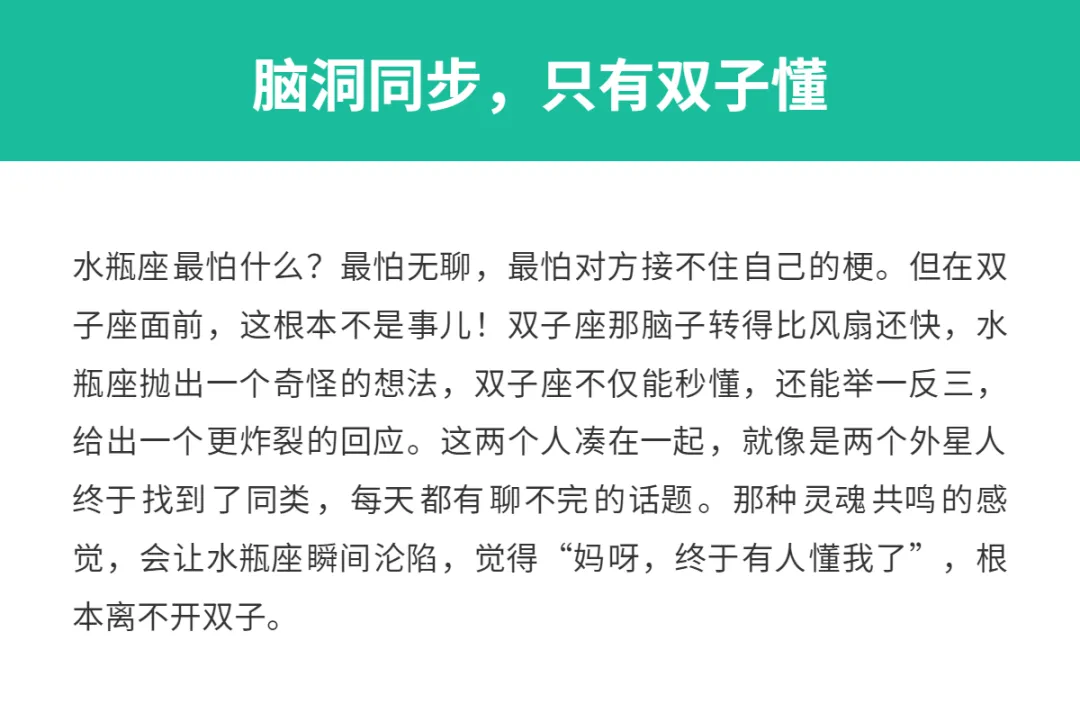 说真的,水瓶座这个外星生物,在感情里绝对是个硬骨头。你跟他们谈恋爱,就像是在跟一阵风赛跑,抓不住也摸不着。他们脑回路清奇,上一秒还在跟你聊哲学,下一秒就消失去拯救世界了,留你一个人在风中凌乱。很多人都说水瓶座是“狗都不谈”的星座,太难搞了!但是,万物相生相克,还真有这么一个星座,能把水瓶座治得服服帖帖,简直就是他们的天选克星。别猜了,这个能拿捏水瓶座的大魔王,就是双子座!