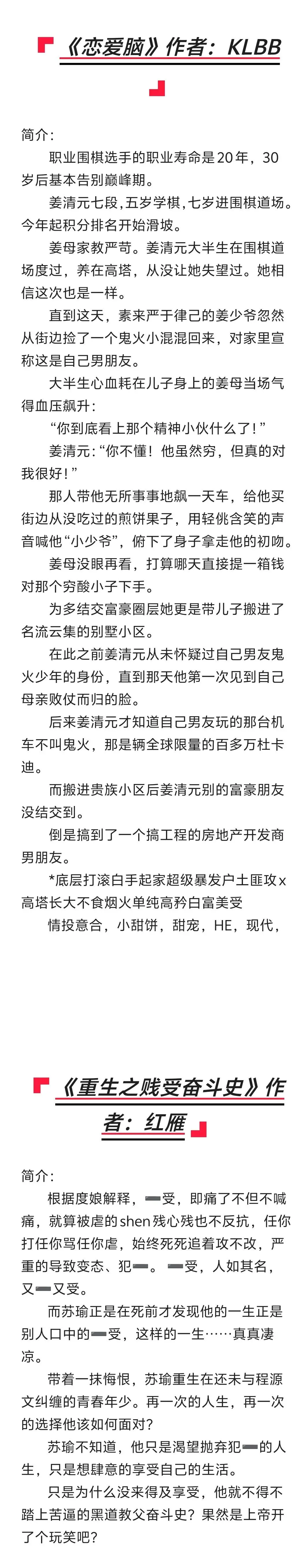 bl推文 《恋爱脑》作者:KLBB《重生之贱受奋斗史》作者:红雁