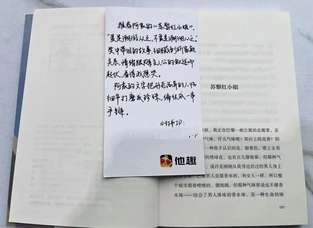 有人晒出《苏黎红小姐》书页间夹着的明信片上对方用工整的字迹写着:"爱是溯游从之,不爱是溯洄从之"