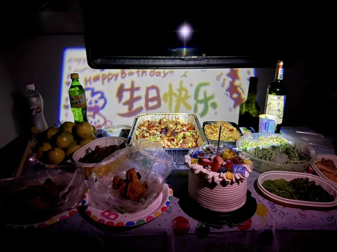 到了酒店才知道小宝已经开好房间了,我在想每次生日都给安排小惊喜,这次还能有吗?好的,就是说咱们家老公在仪式感上从来不差事,一进房间就气氛不对劲了,墙上一个大大的投影,生日快乐🎂,床上都是好吃的,桌子上也都是好吃的,烤鱼、鸭货、大拉皮、辣豆干,超级漂亮的生日蛋糕,还有老公给买的两双小鞋子,呜呜呜呜呃真的好感动啊,我是一个被深深宠爱着的女人,上天真的带我不薄😭真的把之前欠我的都慢慢还给我了,呜呜呜呜感动死了,因为赶了一天的路,没怎么吃东西,所以老公真的是把他能想到的我爱吃的好吃的都给我买回来了,因为怕我太累了不想出去吃,就布置了房间安排了外卖在家吃,啊啊啊啊啊啊啊咱们就说这样的老公谁不稀罕那!