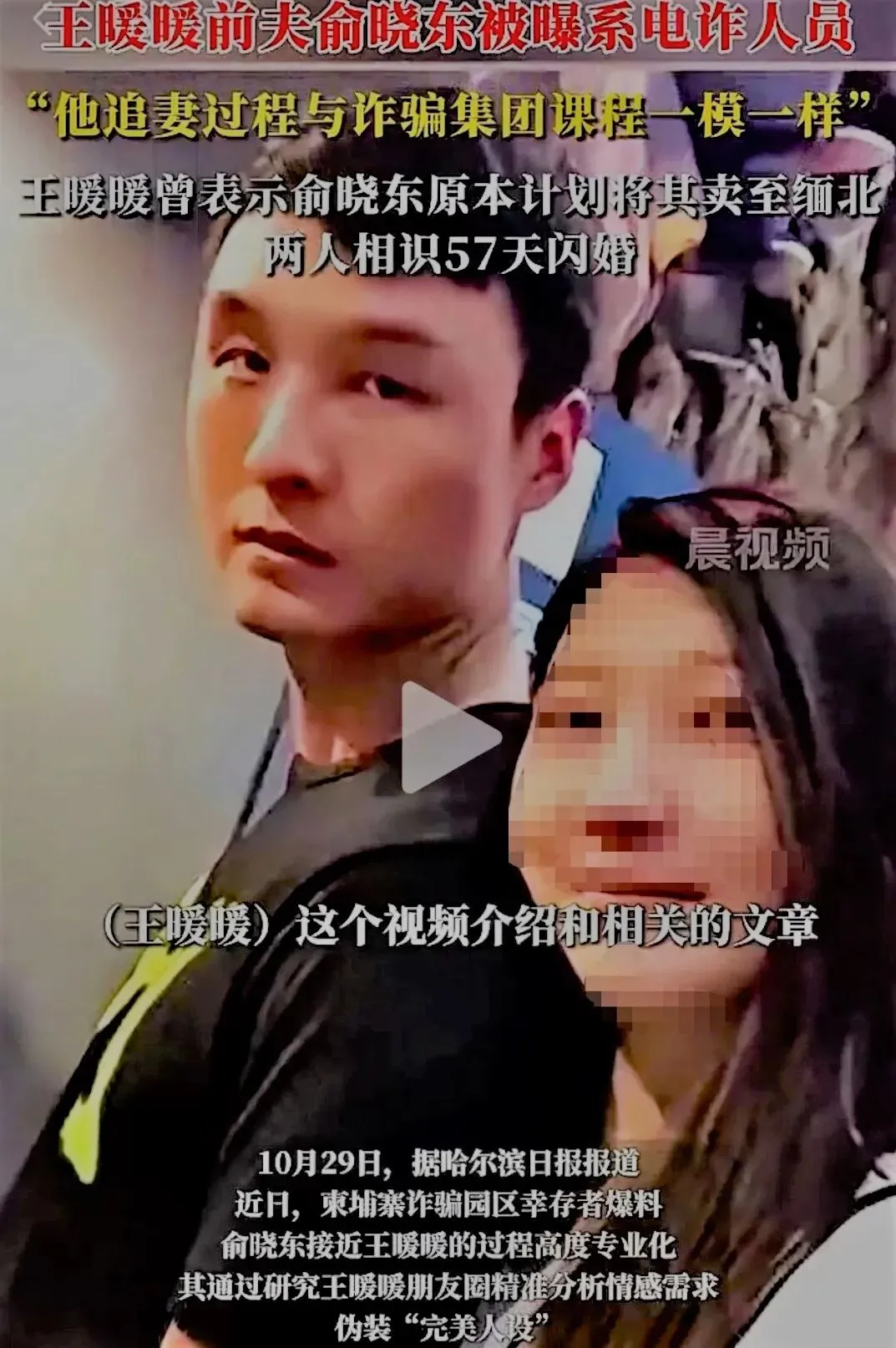 最近,笔者听到一条报道,并根据全网和哈尔滨日报等权威媒体资料了解,“孕妇王某某泰国坠崖案” 当事人王某的前夫俞某东被曝为电诈人员,这场57天闪婚竟只是一场精心策划惊悚的电诈骗局!可以说,这个俞某东在试验婚恋诈骗的过程与诈骗集团课程是一模一样的,”王某某曾表示俞某东原计划将其卖至缅北,所以其猛攻情感,两人相识57天就闪婚了。