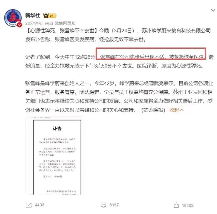 关于张雪峰的离世细节,公司讣告和医院诊断给出的结论是明确的:心源性猝死。3月24日中午12点26分,张雪峰在公司跑步后出现身体不适,被紧急送医,经过数小时抢救,于当天15时50分宣告离世。
