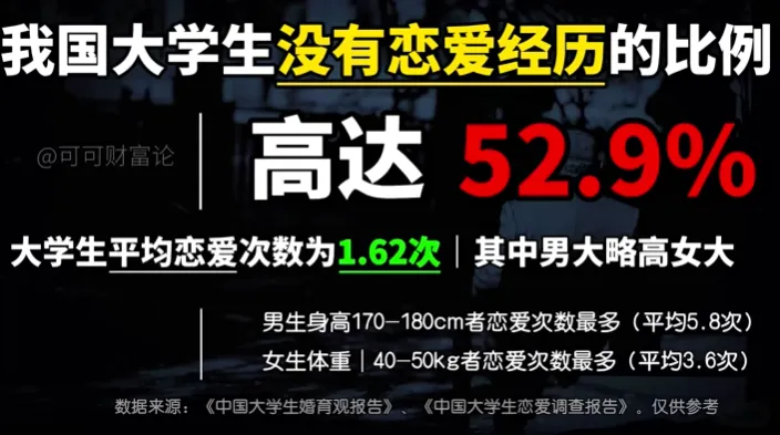 我国大学生里,没有恋爱经历的比例居然高达 52.9%!也就是说,每两个大学生里,就有一个还没尝过恋爱的甜