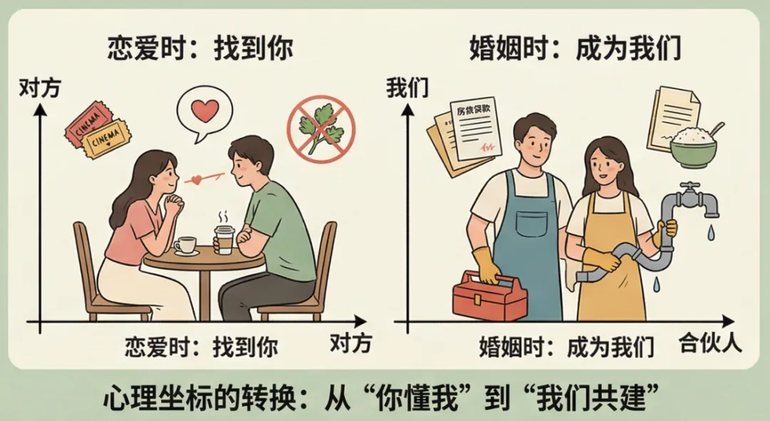 很多夫妻的第一次重大冲突,就发生在从“恋人”到“合伙人”的身份转换地带。你可能会委屈:“你以前都会记住我所有喜好的!”他可能也郁闷:“你怎么现在满脑子都是房贷和柴米油盐?”看,我们还在用“恋爱”的考题,去考“婚姻”的试卷。