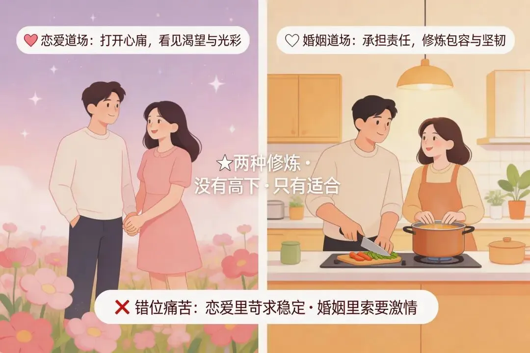 它们不是递进关系,更像是两种不同的修炼道场。有人选择只在恋爱中成长,有人选择进入婚姻中历练,没有高下之分,只有适合与否。