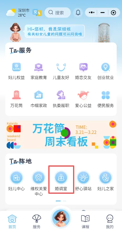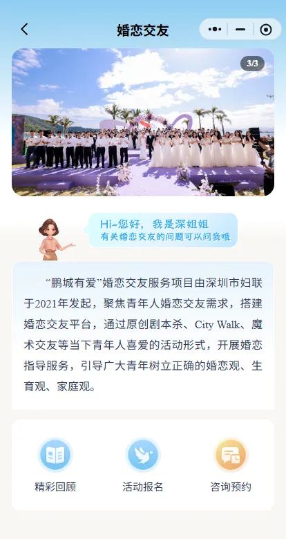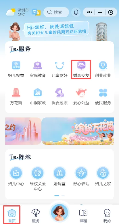 第二步 进入“深i她”小程序首页,在“Ta·服务”中点击“婚恋交友”栏目,选择感兴趣的内容。