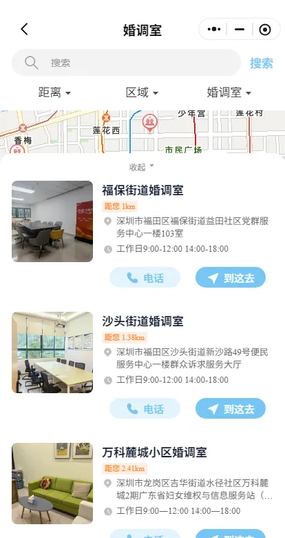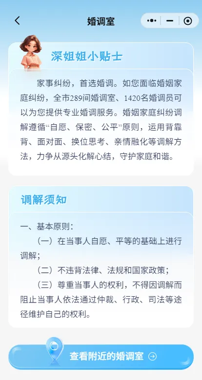 进入“深i她”小程序首页,点击“Ta·阵地”中的“婚调室”板块,再点击查看“附近的婚调室”,即可查询相关信息。