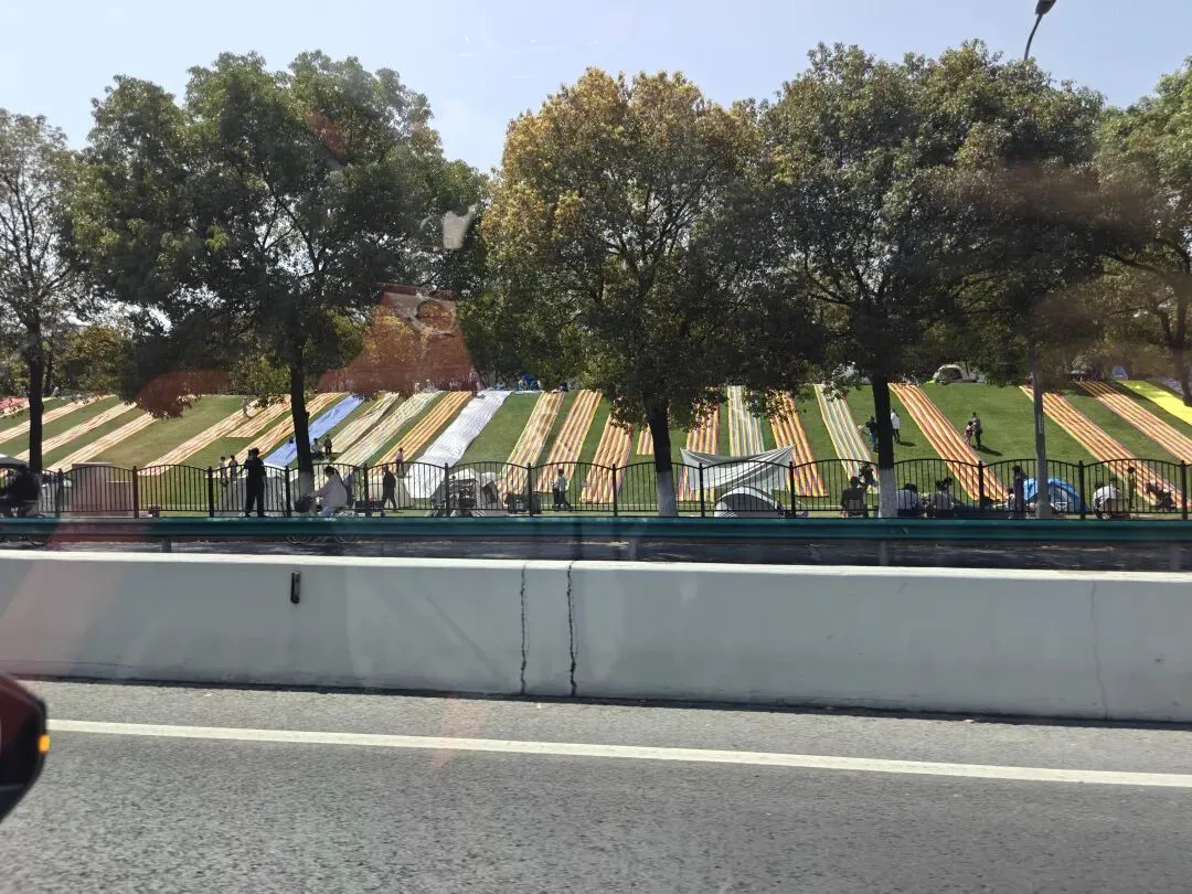 原来那么多条纹带子都是家长自己买的,这样一铺,孩子们就能在上面尽情滑滑梯了。