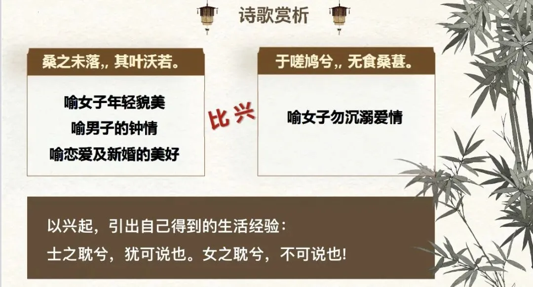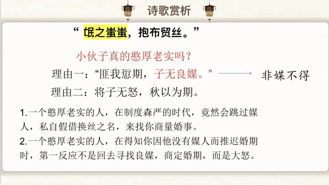 不知不觉间,高中语文学习已经到了最后一本书,马上又要进入到难啃的文言文单元了,最近在讲《诗经·卫风·氓》,本以为这首两千多年前的弃妇诗,会让学生们昏昏欲睡。结果却完全出乎我的意料。课堂氛围非常热烈,学生很感兴趣,讲到氓“抱布贸丝”实则“匪来贸丝”时,有学生脱口而出:“这不就是套路吗?”“简直就是渣男”讲到“将子无怒,秋以为期”,又有人接话:“这女子太傻了”“恋爱脑实锤”